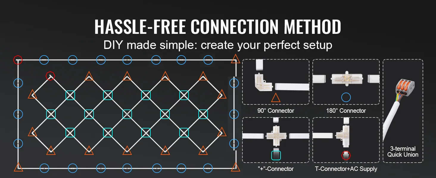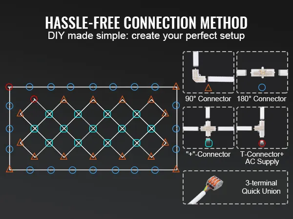 DIY 14 vierkante opstelling: plaats 14 stijlvolle vierkante garagelampen in een elegant rasterpatroon en voeg een modern tintje toe aan elke kamer. Met de meegeleverde Y/V-connectoren kunt u verschillende vormen creëren, waardoor deze autodetaillamp een unieke en veelzijdige doe-het-zelf-decoratie wordt.