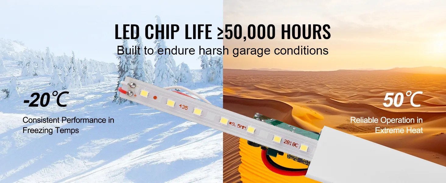 Langdurige LED-levensduur: Deze garageplafondlampen met LED-chips werken goed, zelfs bij extreme temperaturen, van de vrieskou van -20 °C tot de verzengende hitte van 50 °C, waardoor uw onderhoudskosten in de loop van de tijd worden verlaagd.