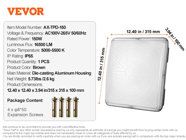VEVOR LED Canopy Light, 150W, 16500LM 5000K Daylight Commercial Industrial Outdoor Canopy Light, 12.4" x 12.4" Surface Mount Ceiling Lighting for Gas Station Warehouse Garage Street Shop Hotel, IP65
