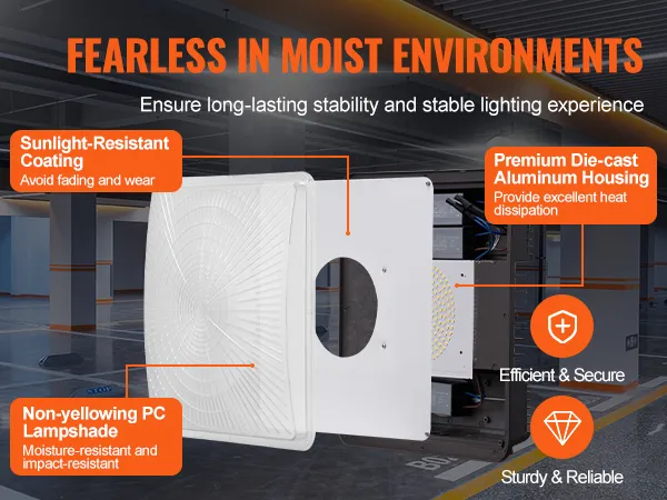 Reliable IP65 Waterproofing: Experience peace of mind with our LED canopy lights, featuring an IP65 waterproof rating to thrive in humid conditions. Say goodbye to worries about short circuits or electrical hazards. Equipped with rust-resistant die-cast aluminum housing and PC lampshade, each light is finished with sunroof powder coating to resist fading and abrasion. Illuminate confidently, rain or shine!