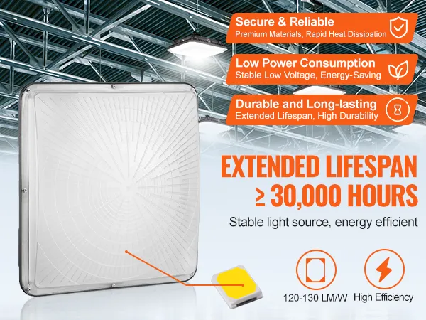 High Performance, Long-lasting: Achieve unparalleled stability and energy efficiency with our outdoor LED canopy lights. They provide a stable light source, high energy efficiency, and an extended lifespan exceeding 30,000 hours. They are certified for security (FCC certified in the US and CE certified in Europe), ensuring superior quality and stringent standards.
