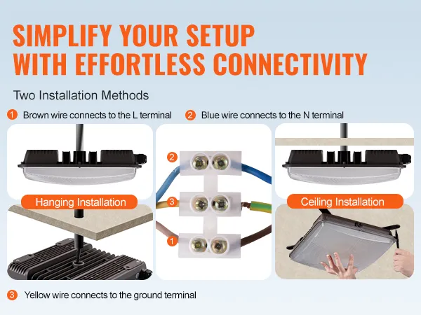 Installation Made Easy: Our LED canopy lights support hanging and ceiling mounting, making installation simple enough for one person to handle independently. Plus, each unit comes with a peace-of-mind accessory pack, including mounting brackets and screws for wall installation. Just follow the instructions provided, and you'll have them up and running in no time.