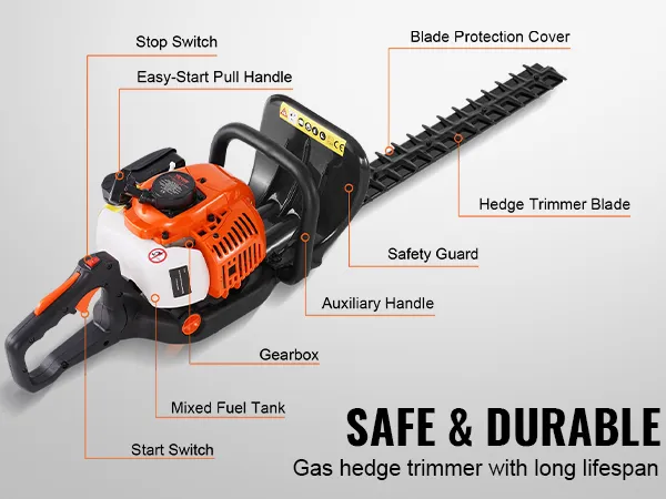 Efficiënt snoeien: Uitgerust met een 26 CC tweetaktmotor en een toerental van 8500 tpm, biedt de heggenschaar op benzine krachtige prestaties. De messnelheid van 6500 tpm zorgt voor scherp en efficiënt snoeien van takken, struiken, theetuinen en groenstroken.