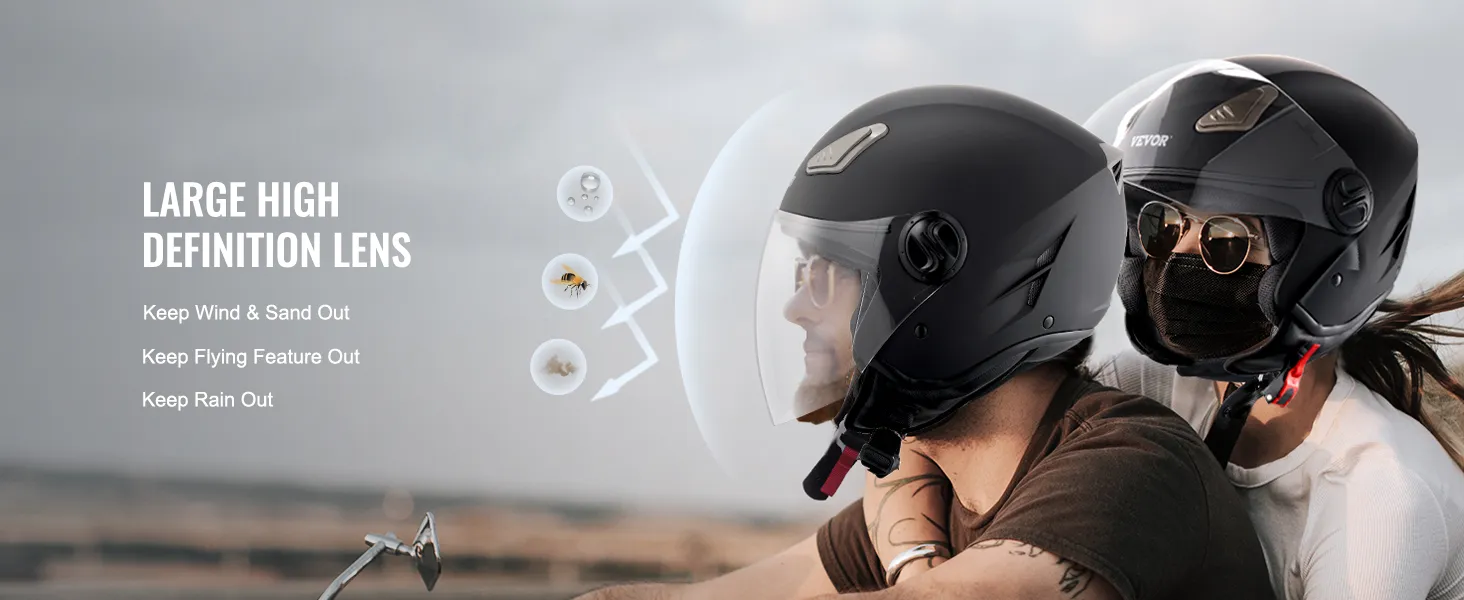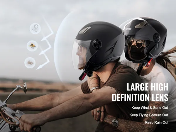 Open Vision: De motorhelm is uitgerust met een grote transparante lens. Het ontwerp met grote transparante lenzen beschermt niet alleen effectief tegen wind, zand en vliegende wezens, maar zorgt ook voor een open zicht en minimaliseert de kans op een ongeval.