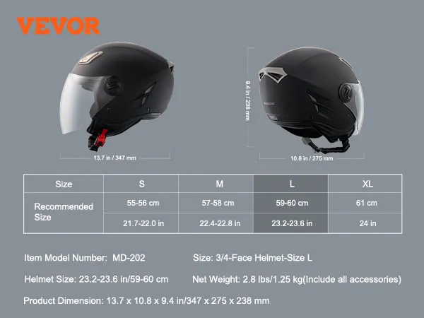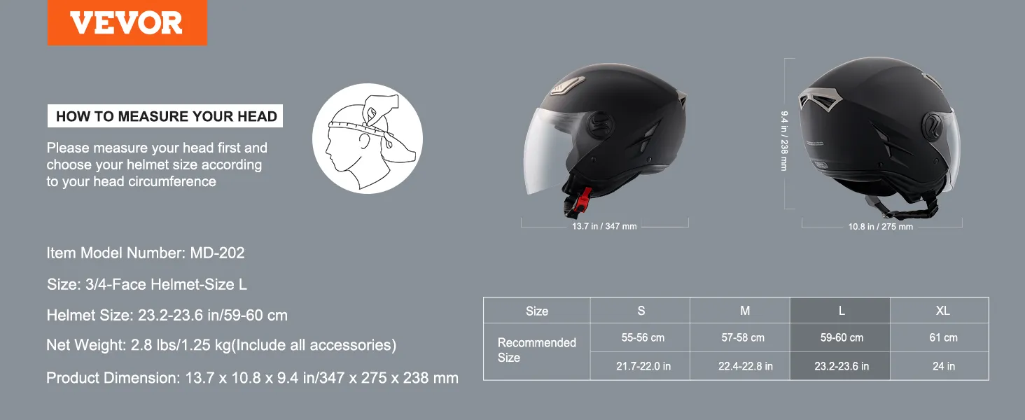 VEVOR Motorcycle Helmet, 3/4-Face, Smart Street ABS & High Density Helmet with Bluetooth Communications & Interchangeable Lens, DOT Approved Comfortable Motocross Helmet, Fit for Youth & Adults