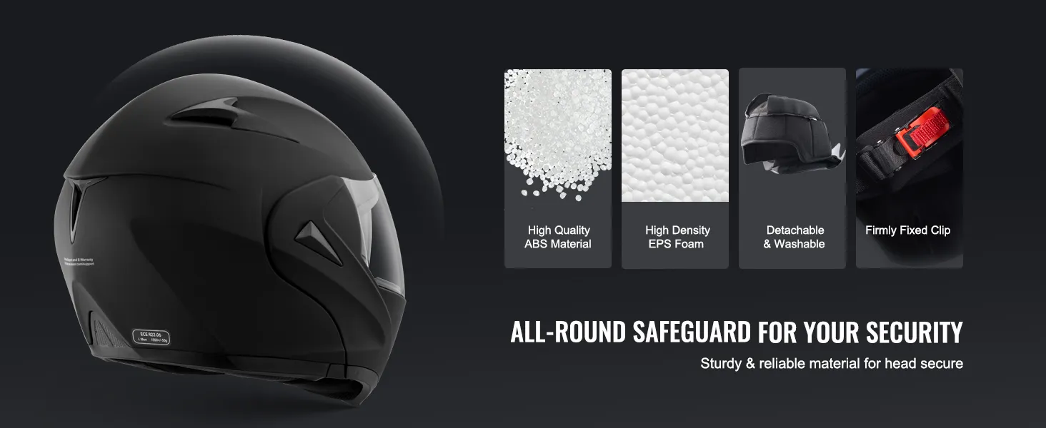 ECE-goedgekeurd en robuust: Deze motorhelm is ECE-gecertificeerd en voldoet aan de wettelijke eisen in de VS. De robuuste ABS-schaal, gecombineerd met zacht EPS-schuim en huidvriendelijke voering, biedt volledige bescherming voor uw hoofd.