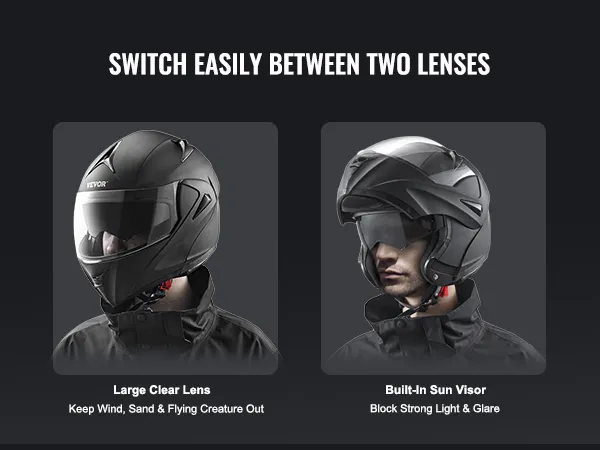 Geïntegreerde zonwerende lens: De motorhelm is uitgerust met een grote, heldere lens die de wind blokkeert en toch een hoge resolutie behoudt, waardoor de kans op een ongeval minimaal is. De geïntegreerde donkere lens blokkeert schittering en reflecties en voorkomt visuele vermoeidheid.