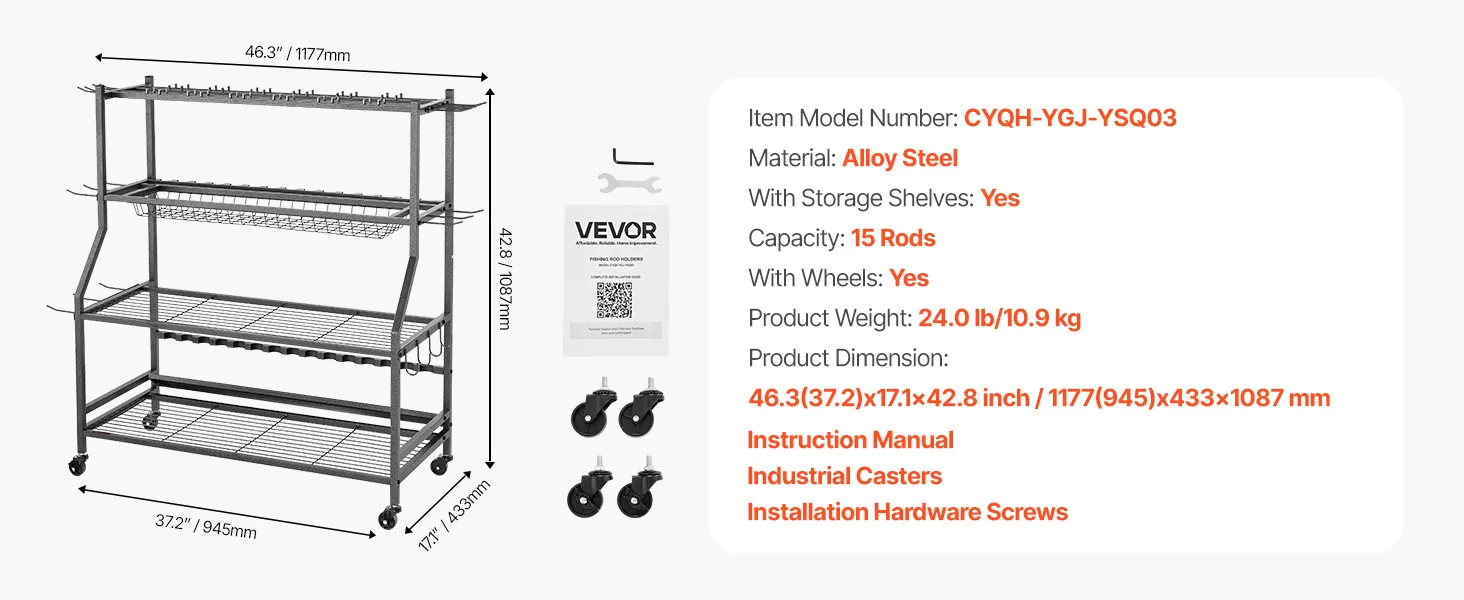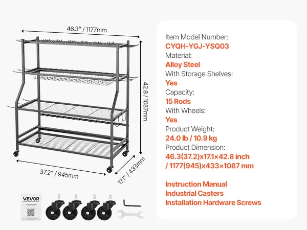 VEVOR Hengelhouder voor 15 hengels, rollende hengelhouder van gelegeerd staal voor organisatie en opslag, ruimtebesparende vloerstandaard voor visgerei, cadeaus voor visliefhebbers
