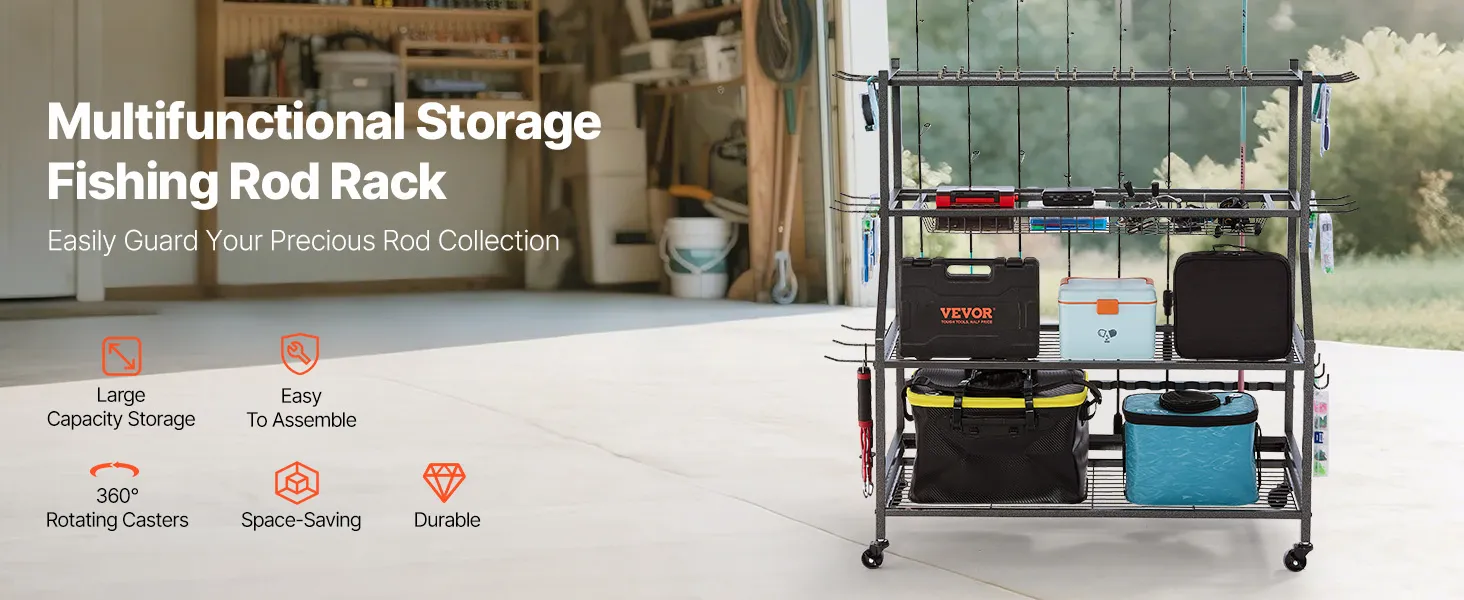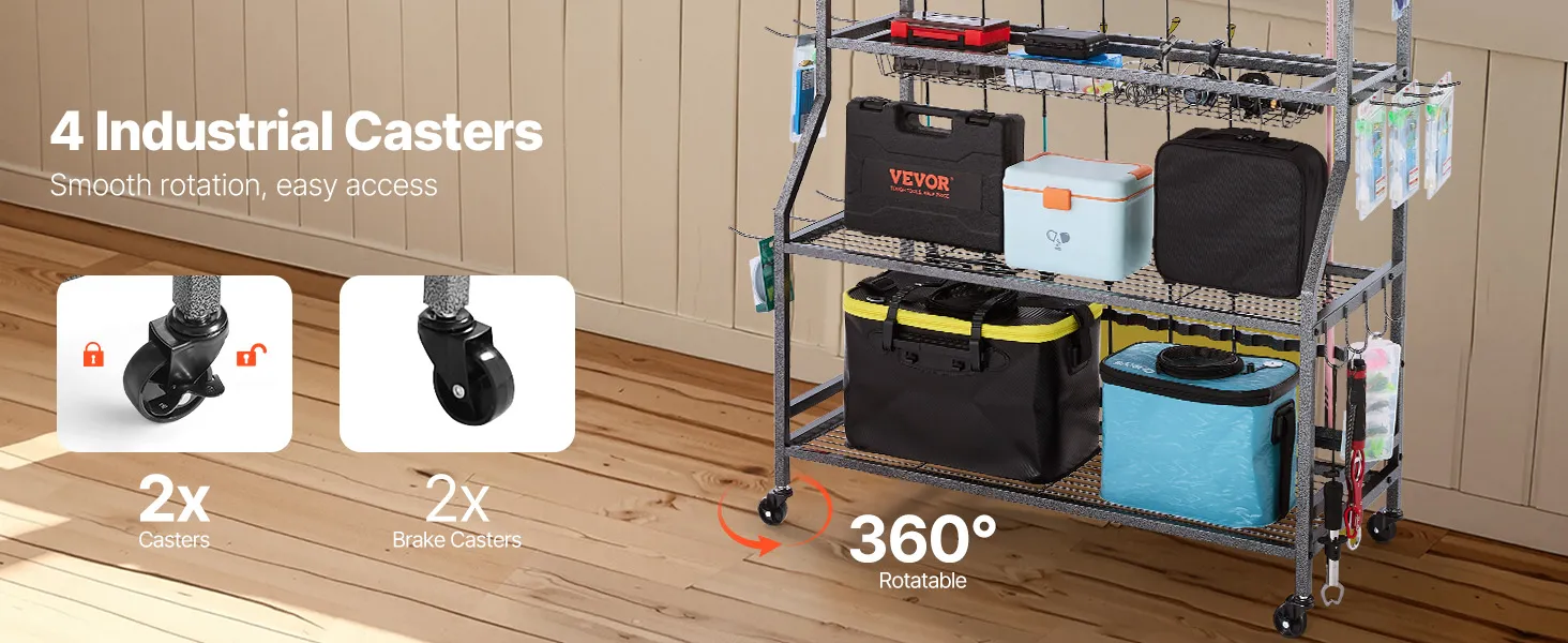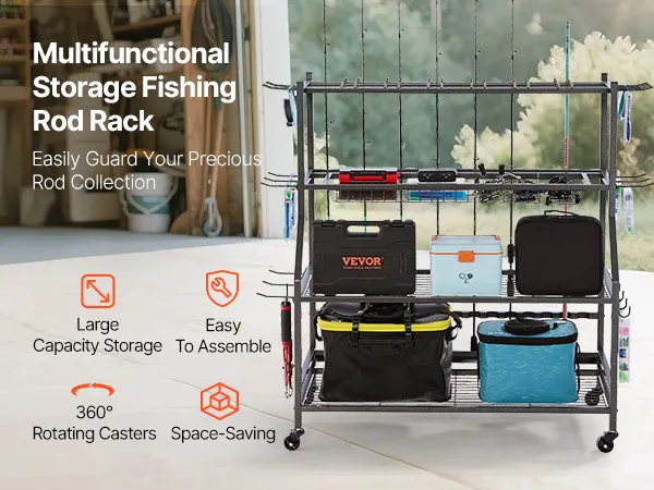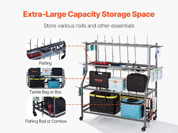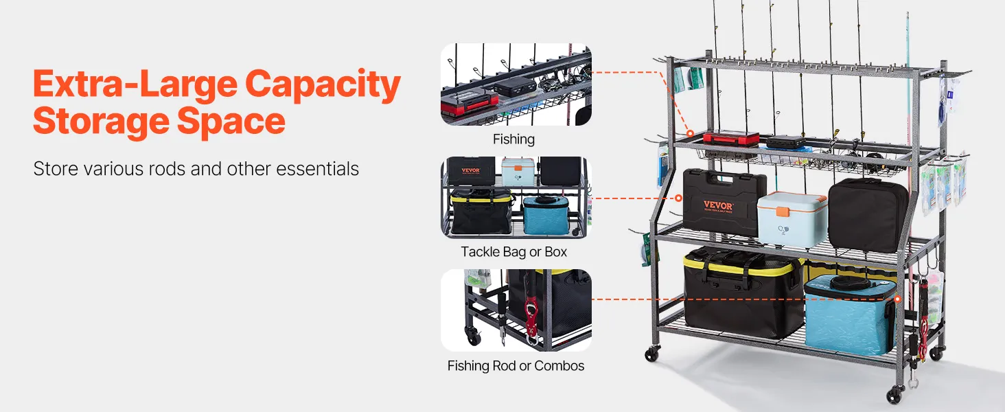 Multifunctionele opbergruimte: De meerlaagse hengelhouder biedt voldoende opbergruimte, zodat je grote viskoffers en kleinere accessoires netjes kunt opbergen. Zo blijft je visgerei altijd georganiseerd.