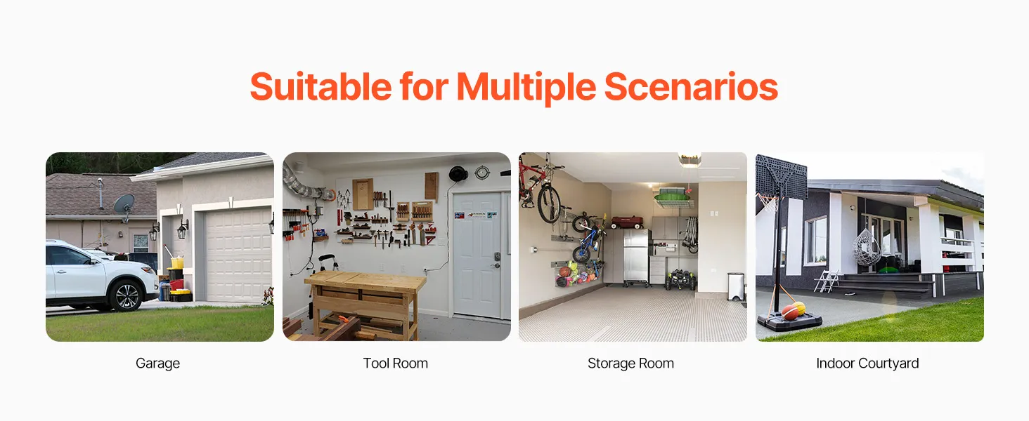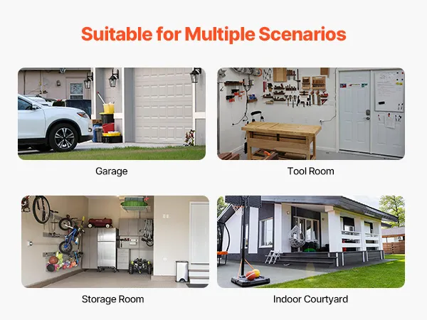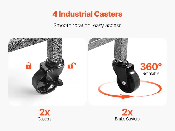 360° mobiliteit: De garagehengelhouder is voorzien van vier robuuste industriële wielen en een geïntegreerd 360° draaisysteem van stalen platen. Twee van de wielen zijn voorzien van remmen voor eenvoudige montage. Het verplaatsbare ontwerp zorgt voor gemakkelijke toegang tot de visuitrusting.