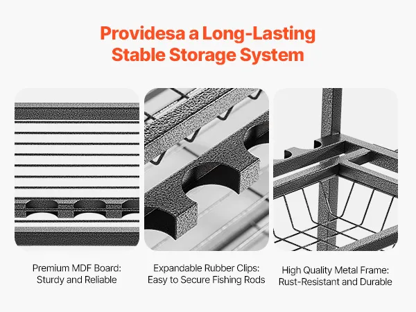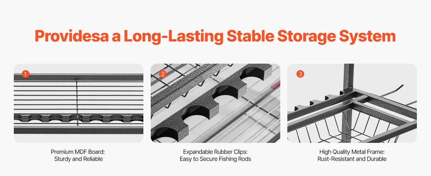 Hoge duurzaamheid: Gemaakt van hoogwaardige materialen, is deze hengelstandaard stevig en minder gevoelig voor scheuren. Hij is bestand tegen het gewicht van hengels en externe invloeden. De randen zijn voorzien van uitschuifbare rubberen clips die het gemakkelijk maken om hengels vast te zetten. Het zachte rubberen ontwerp voorkomt beschadigingen of krassen op de hengel.