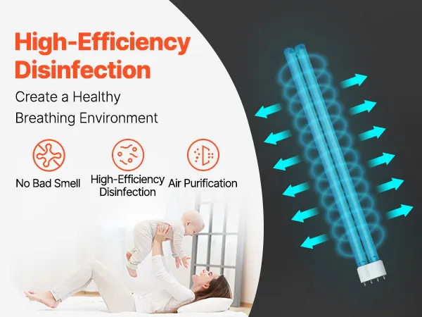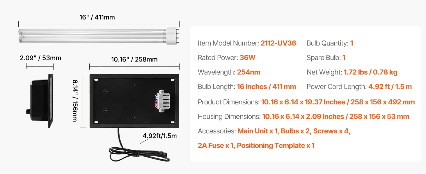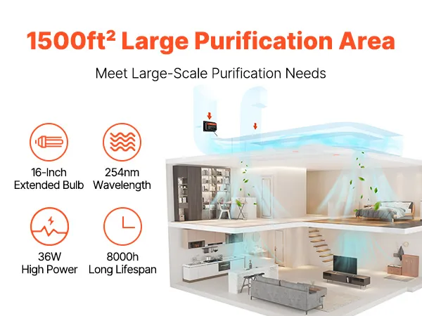 Betrouwbare en duurzame kwaliteit: elke lampbuis heeft een levensduur van maximaal 8.000 uur en wordt geleverd met een vervangende lamp, waardoor de totale levensduur van het AC UV-licht aanzienlijk wordt verlengd. Om de duurzaamheid te garanderen, wordt aanbevolen om frequente aan/uit-cycli te vermijden.