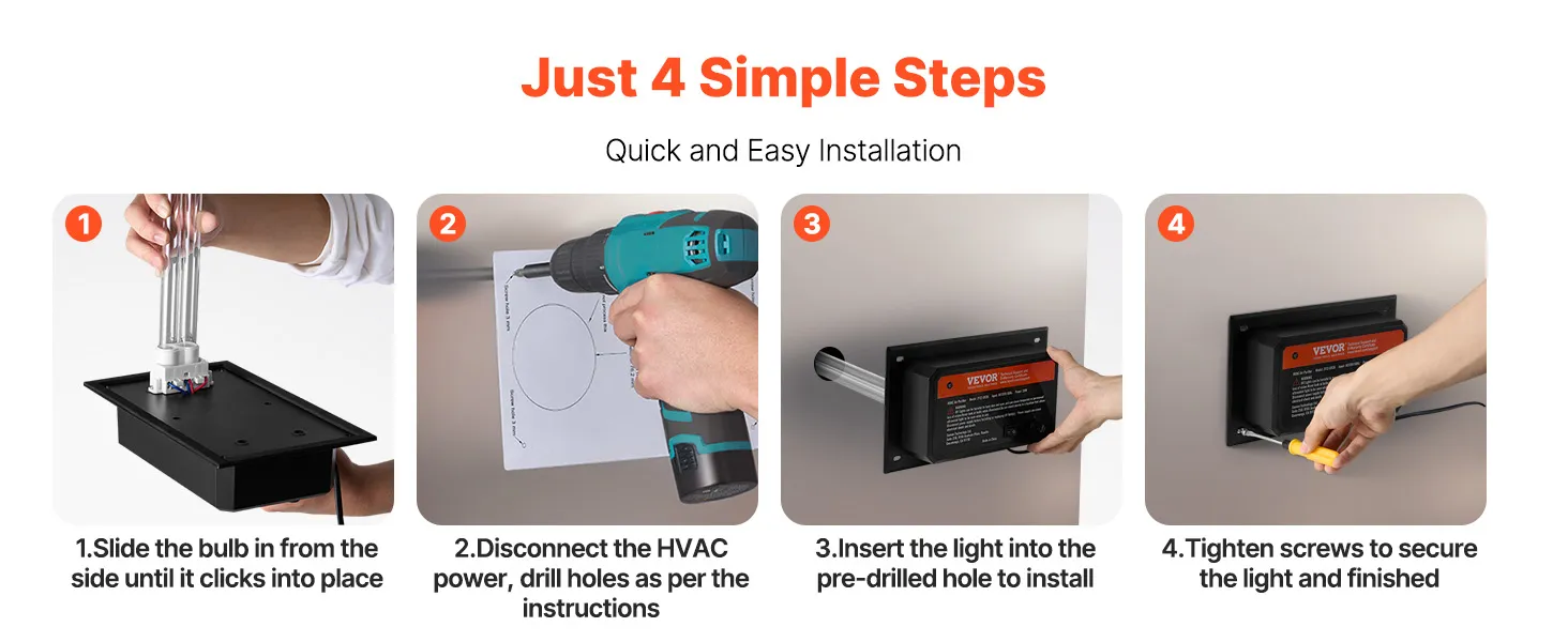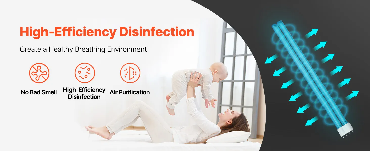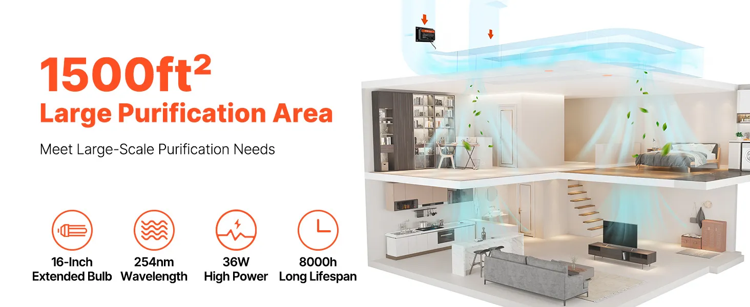 Efficiënte luchtzuivering: de HVAC-kanaalreiniger maakt gebruik van een 36 W UVC-lamp die ultraviolet licht uitstraalt met een golflengte van 254 nm om de meeste verontreinigende stoffen effectief van HVAC-kanaaloppervlakken te verwijderen, waardoor de luchtkwaliteit wordt verbeterd en een schone, gezonde leefruimte wordt bereikt. EPA-schatting nr. 94721-CHN-1