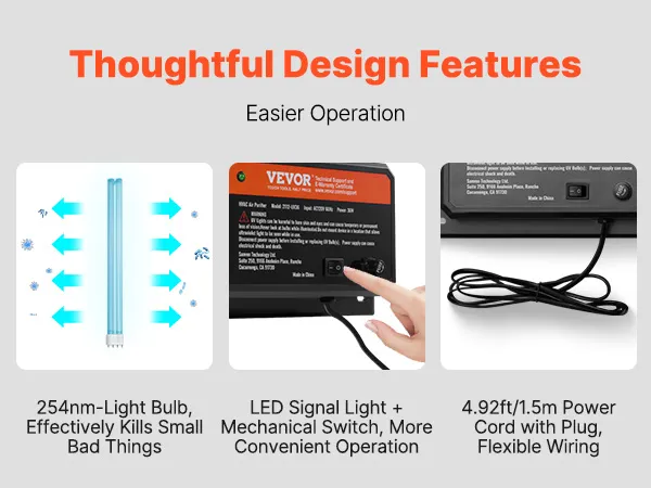 Moeiteloze bediening en onderhoud: De mechanische schakelaarbediening is eenvoudig en het LED-display geeft duidelijk de bedrijfsstatus van de UV-C-lamp weer. De 1,5 meter lange voedingskabel biedt meer flexibiliteit tijdens de installatie.