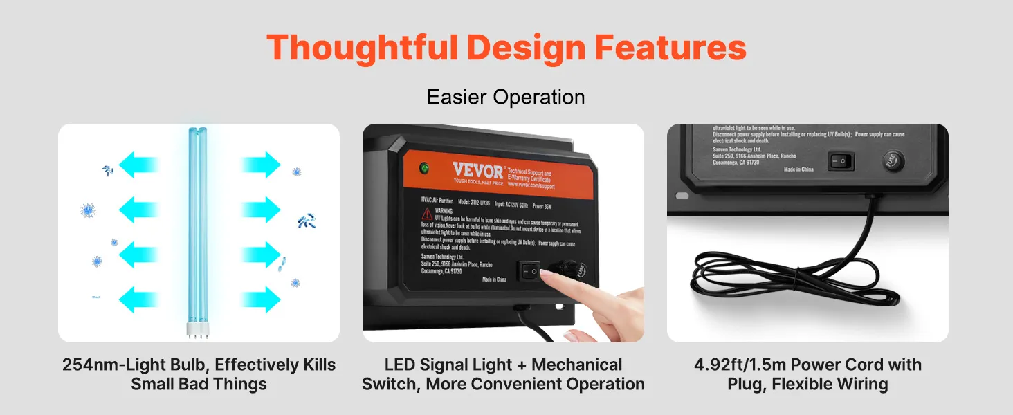 VEVOR HVAC-luchtreiniger voor het hele huis, 36W 254nm UVC-licht in kanaal voor airconditionerkanalen, luchtwasser met 1 reservelamp, HVAC UV-lampen, luchtreiniger voor airconditioners