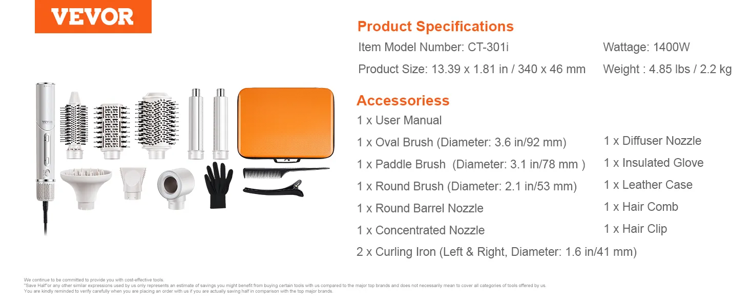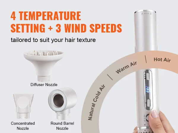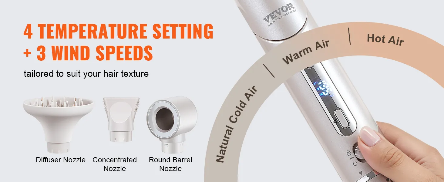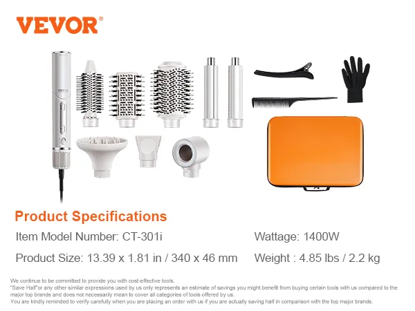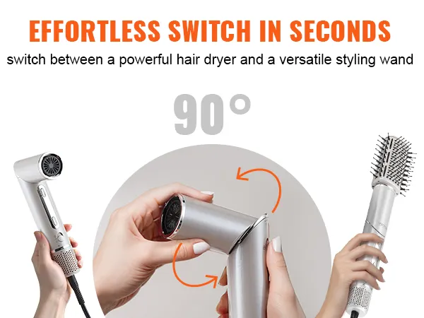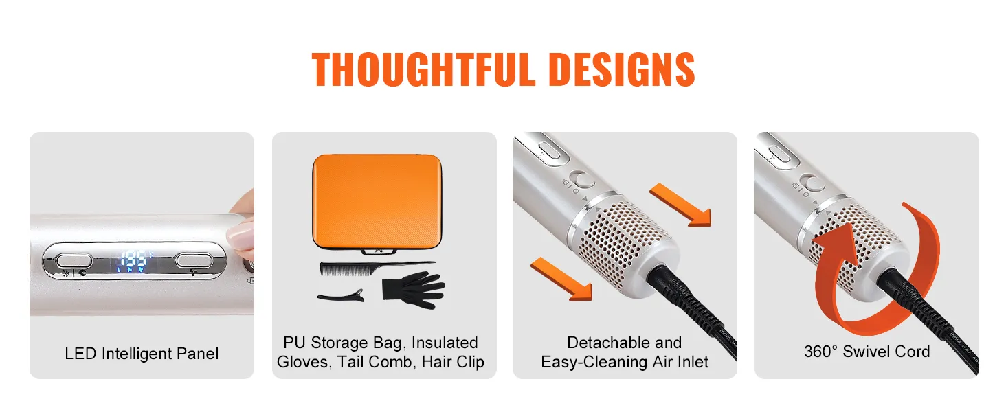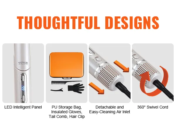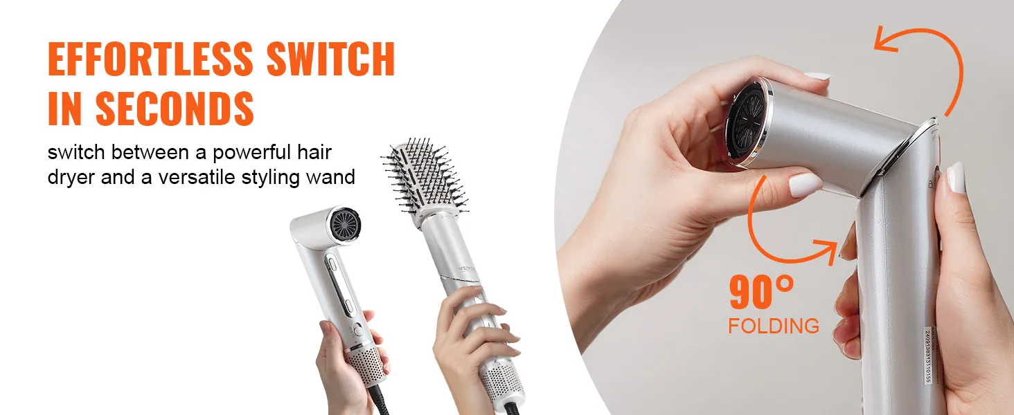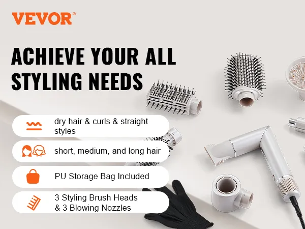 Veelzijdige 7-in-1 haarstyler: VEVOR 7-in-1 haarstyler en droge borstel bevat 2 automatisch opwindende krulspelden, 3 mondstukken en 3 verschillende stylingborstels om aan al uw stylingbehoeften te voldoen en het stylen gemakkelijker te maken. Bovendien kan het mondstuk 90 graden worden gevouwen, waardoor een betere controle over de hoek tijdens het drogen mogelijk is.