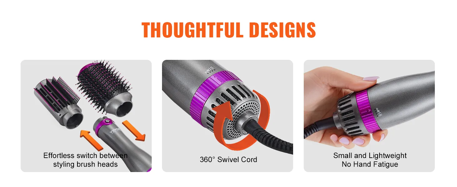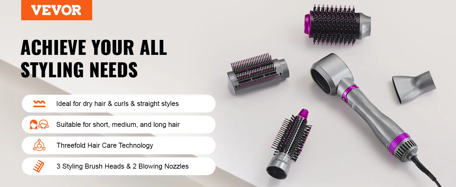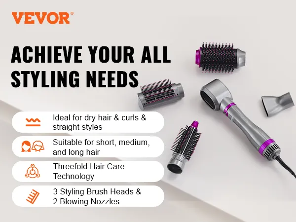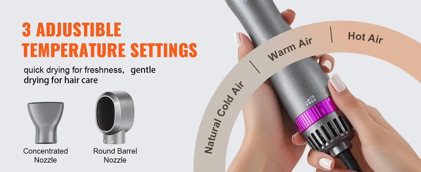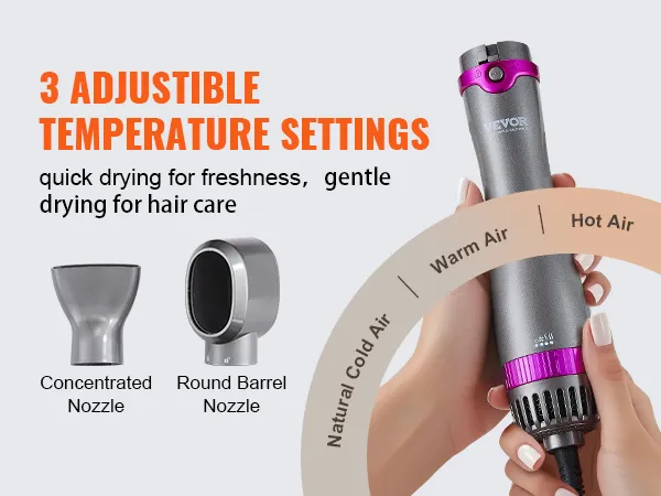 VEVOR 5-in-1 hair dryer brush comes with 3 brush heads and 2 nozzles (round, paddle and oval brush, round barrel and concentrated nozzle), allowing you to effortlessly create exquisite hairstyles and offer versatile styling effects.