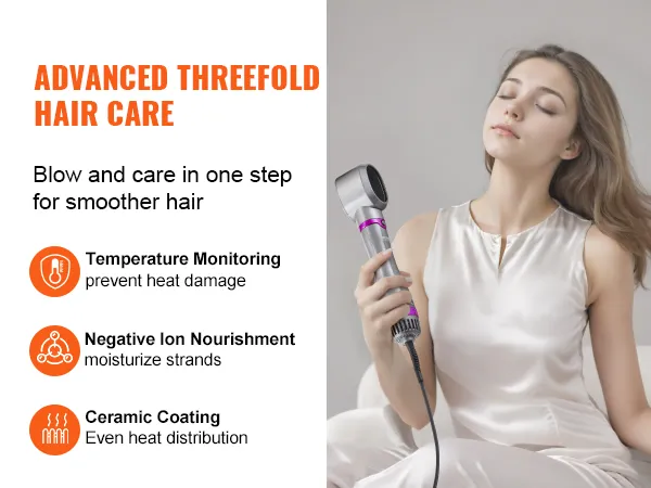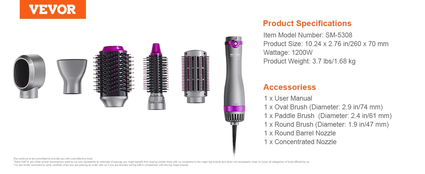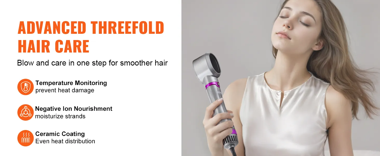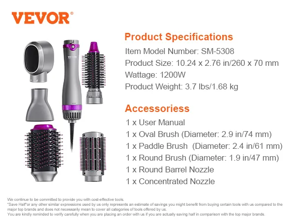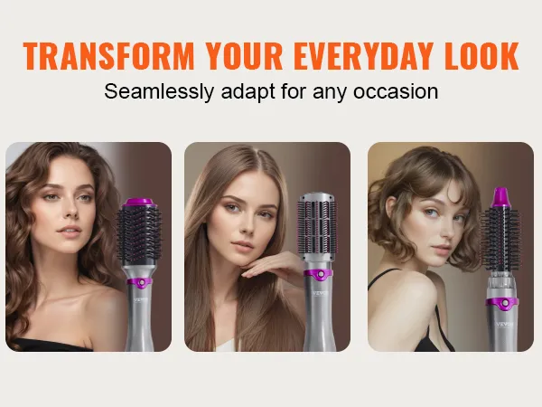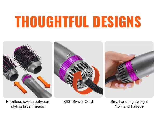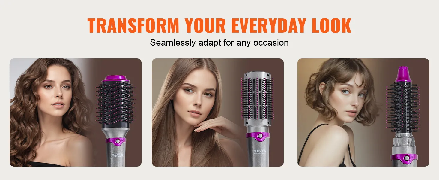VEVOR 5-in-1 hair dryer brush comes with 3 brush heads and 2 nozzles (round, paddle and oval brush, round barrel and concentrated nozzle), allowing you to effortlessly create exquisite hairstyles and offer versatile styling effects.