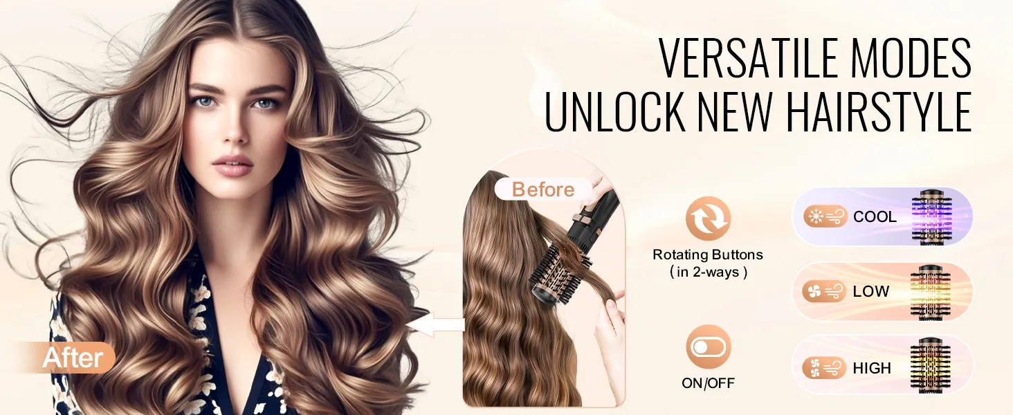 Gepersonaliseerde haarstyling: Met de 360° automatische tweerichtingsrotatie van de VEVOR heteluchtstylingborstel kunt u verschillende krulrichtingen selecteren om automatisch natuurlijke golven of krullen te creëren, waardoor de tijd die u aan handmatig stylen besteedt aanzienlijk wordt verminderd. Het beschikt ook over 3 instelbare instellingen (koel, laag en hoog) voor verschillende haartypes en stylingvoorkeuren.