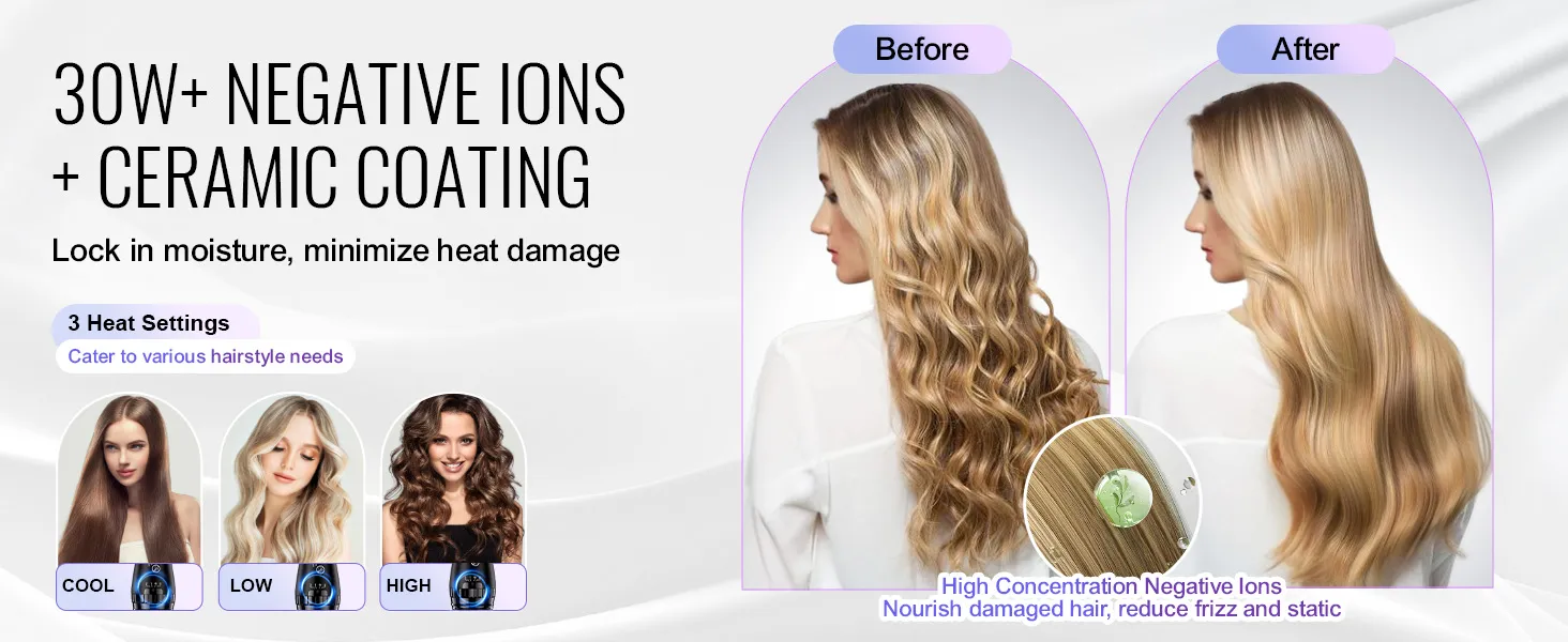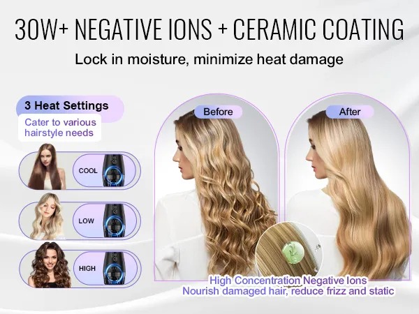 Met geavanceerde keramische coating en 30W+ negatieve ionen vermindert het effectief hitteschade terwijl het vocht vasthoudt voor gladder en gezonder haar.
