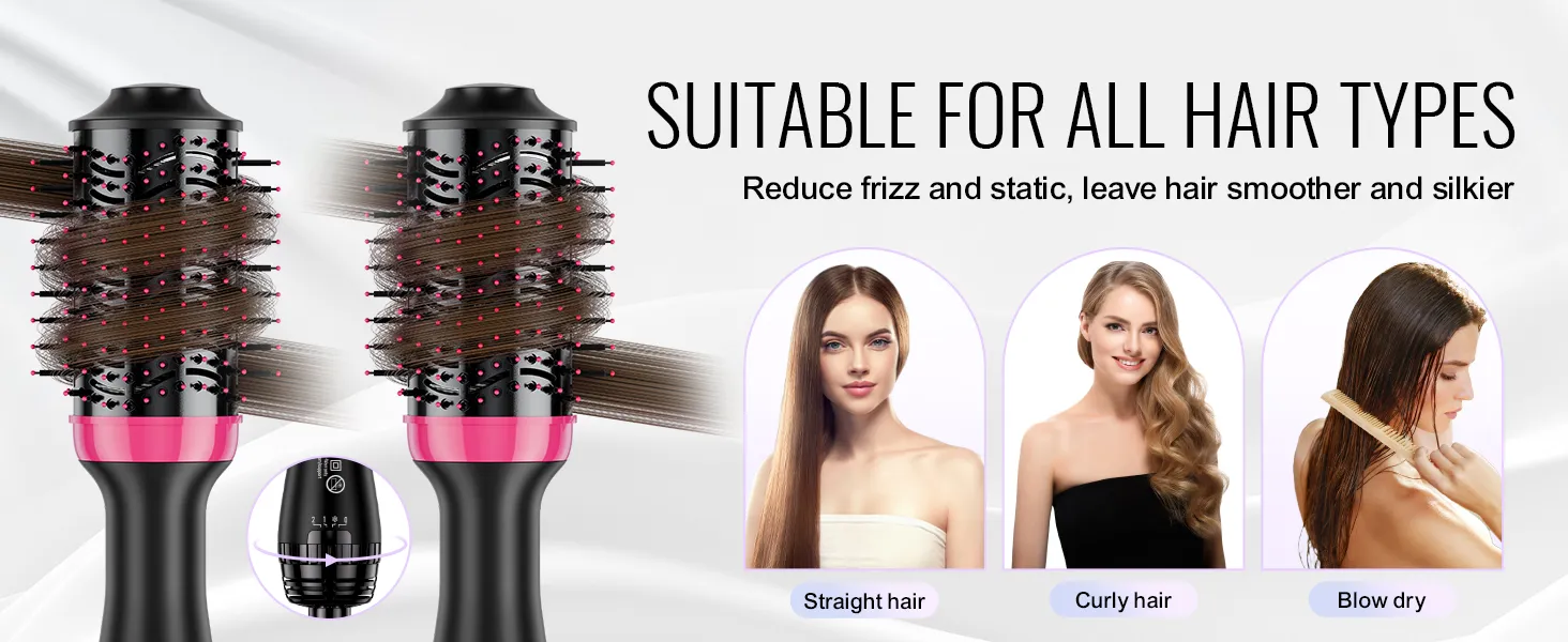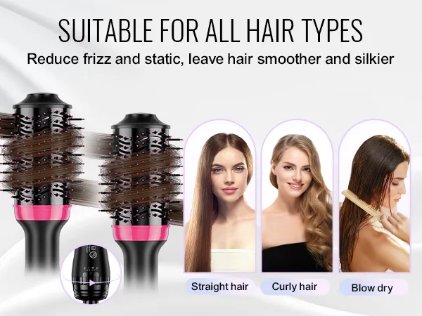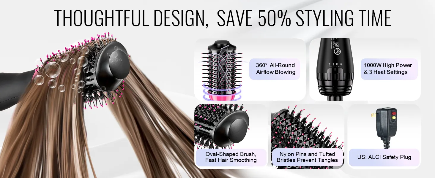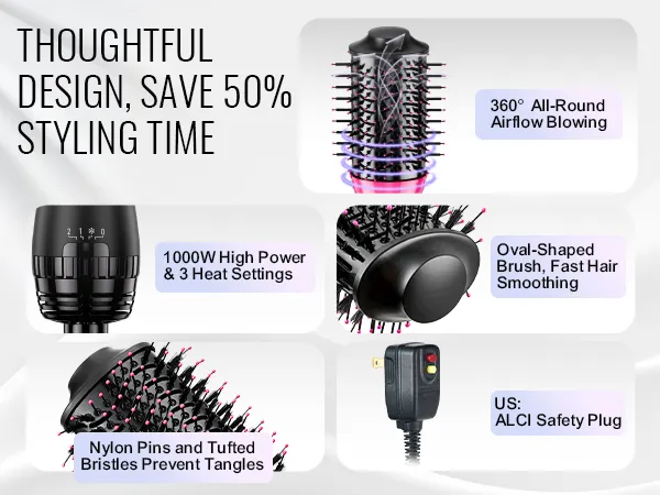 Snel en moeiteloos stylen: bereik moeiteloos gladde en ideale kapsels met ons 360° luchtstroomsysteem en krachtig vermogen van 1000 W. De ovale opzetborstel van 65 mm (2,56 inch) met nylon pinnen en getufte borstelharen maakt uw haar effectief recht en voorkomt klitten.