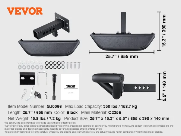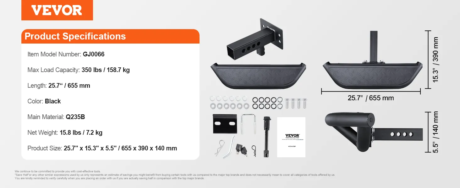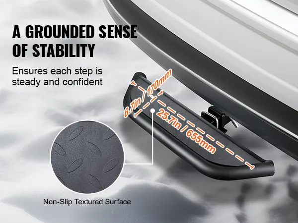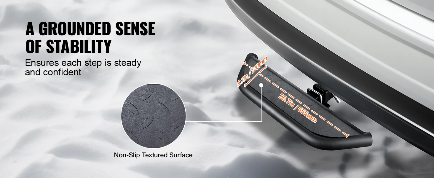 Anti-Slip Step: With a length of 25.7 inches / 655 mm, this hitch step features a textured plastic surface for increased foot traction, effectively preventing slipping. It ensures a secure foothold even in wet conditions, greatly improving comfort when getting in and out of the vehicle. It is friendly for elderly people, children, and pets, offering reliable security.