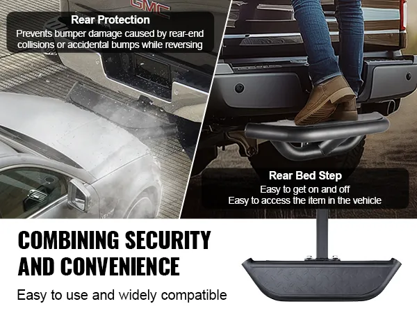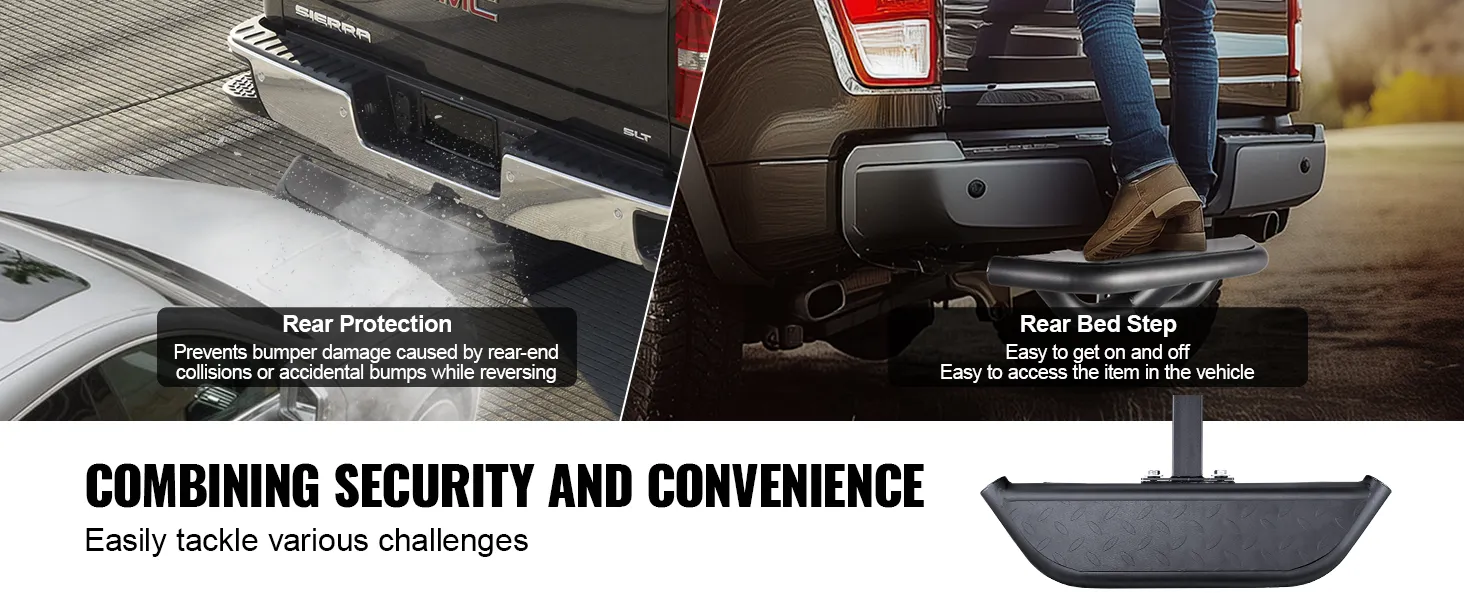 Security and Practicality: This hitch step is both a robust security feature and a practical tool for loading and unloading. It provides maximum protection for your vehicle’s rear, resisting rear-end accidents, scratches, and impacts. It absorbs most of the shock to buffer your vehicle, reducing the risk of more severe injuries to you and your passengers. Its thoughtful design offers a stable stepping point, and it helps with loading and unloading heavy items, enhancing your overall experience.