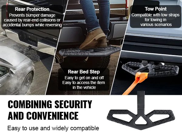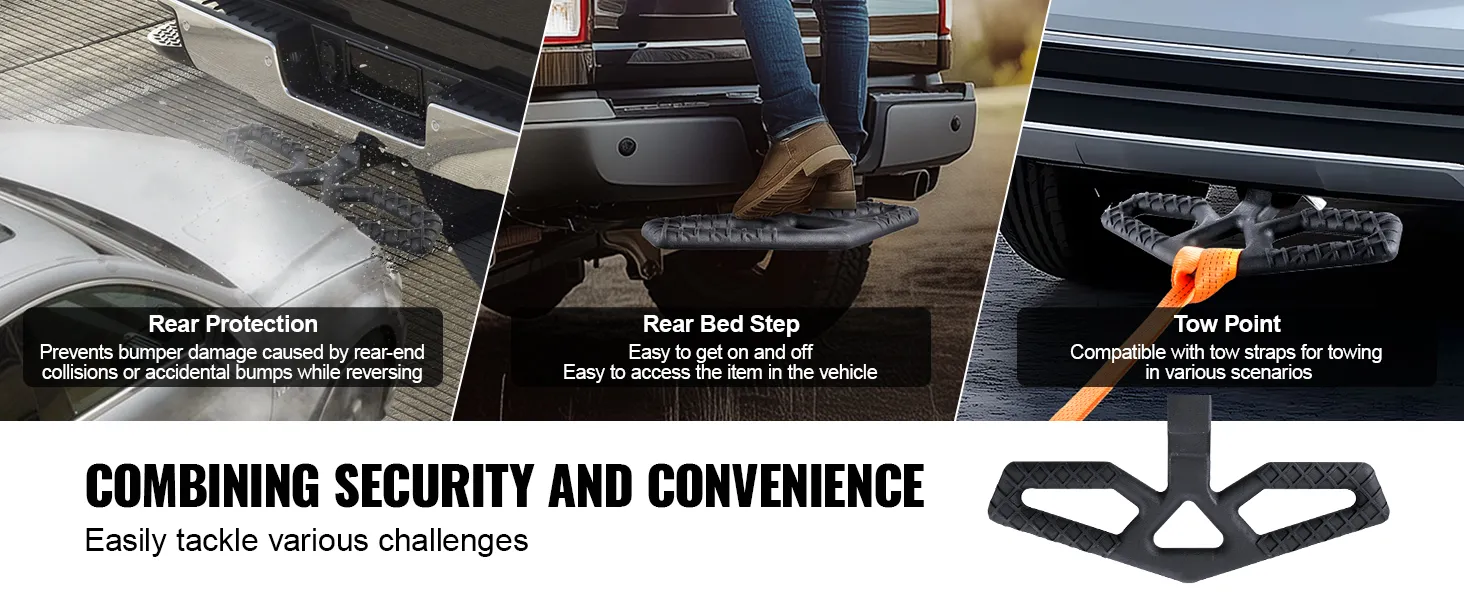 Security Guard: The trailer hitch step provides a stable foothold when reaching the roof or getting in and out of the vehicle. It also helps protect the rear bumper from impacts, the arrow shape allows it to function as a towing and recovery device
