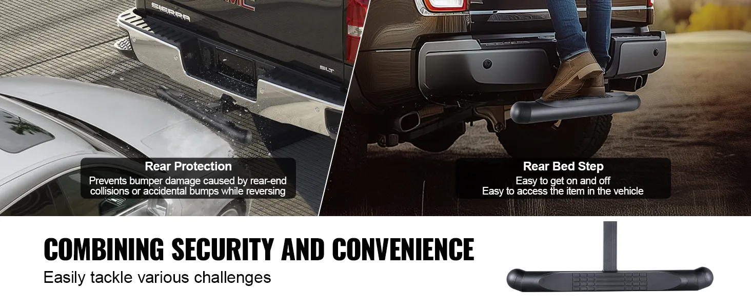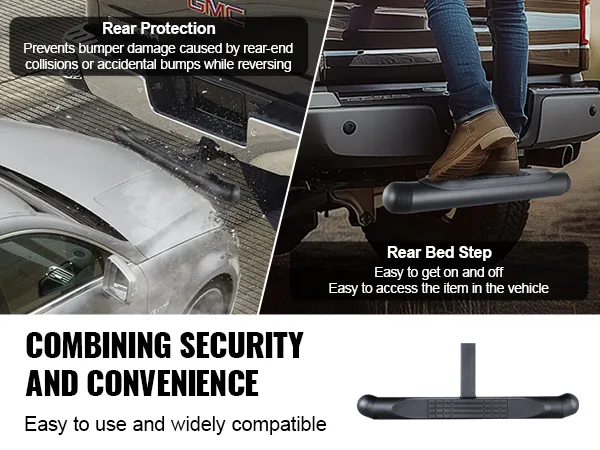 Security and Practicality: This hitch step is both a robust security feature and a practical tool for loading and unloading. It provides maximum protection for your vehicle’s rear, resisting rear-end accidents, scratches, and impacts. It absorbs most of the shock to buffer your vehicle, reducing the risk of more severe injuries to you and your passengers. Its thoughtful design offers a stable stepping point, and it helps with loading and unloading heavy items, enhancing your overall experience.