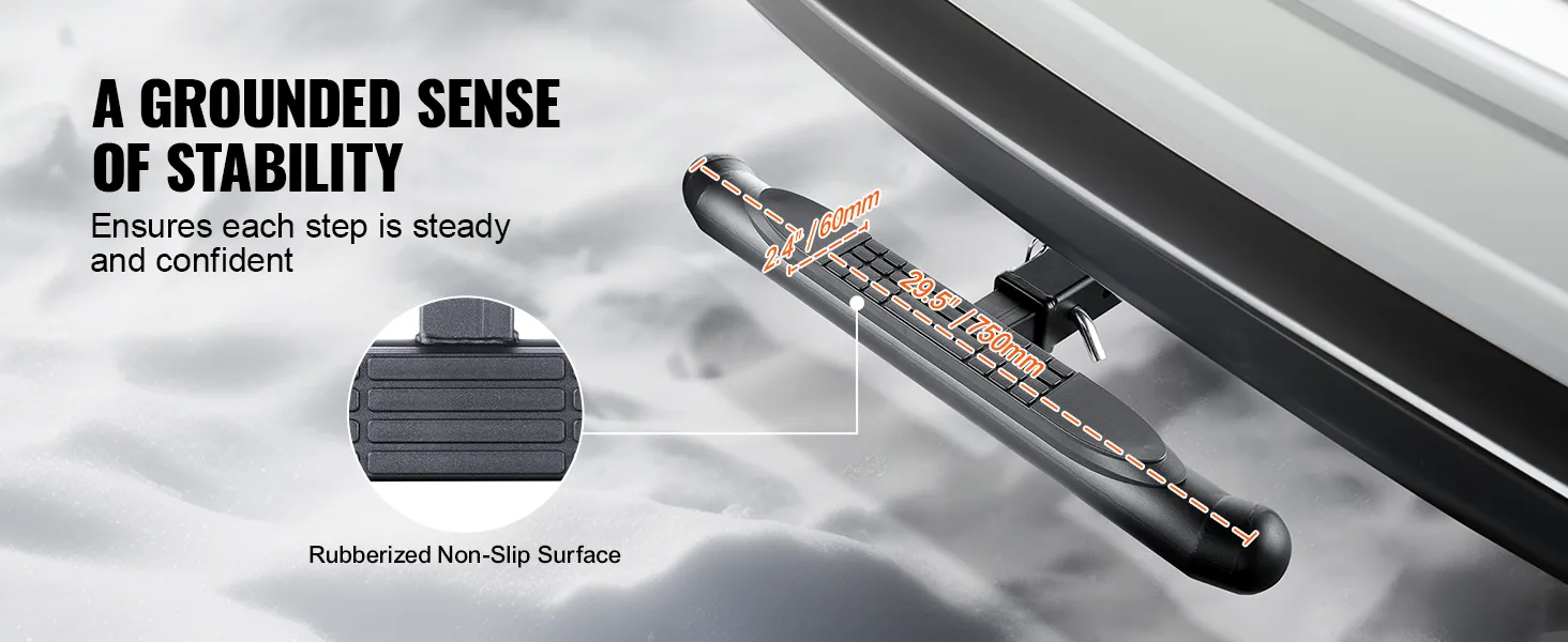 Our hitch step serves as a sturdy rear vehicle protection barrier, absorbing most impacts to buffer your vehicle and reduce the risk of more severe injuries to you and your passengers. It also acts as a reliable climbing support, allowing you to enjoy every journey with confidence.