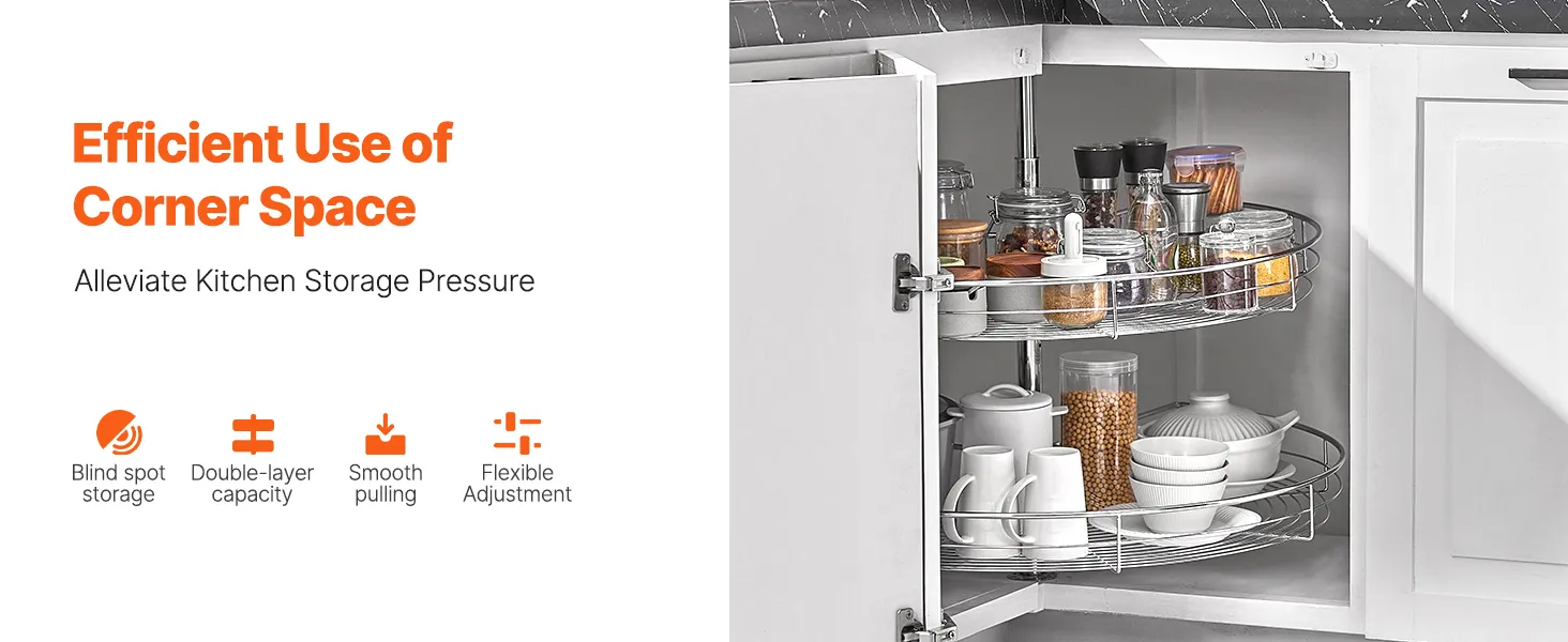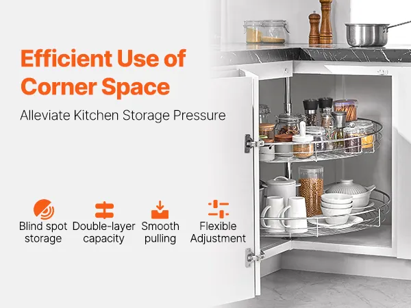 Flexibele aanpassing: Uitgerust met verstelbare stangen en verticale steunen, voldoet de hoekplank van de kast aan verschillende hoogte-eisen en is geschikt voor meerdere installatiematen (≥35,43 x ≥35,43 x (22,05 - 29,13) inch / ≥900 x ≥900 x (560) -740) mm) en kan eenvoudig in bestaande keukenindelingen worden geïntegreerd.