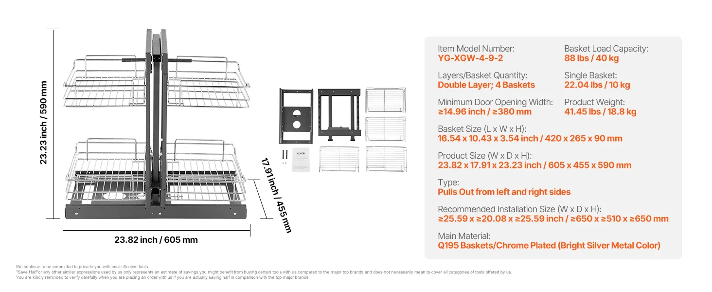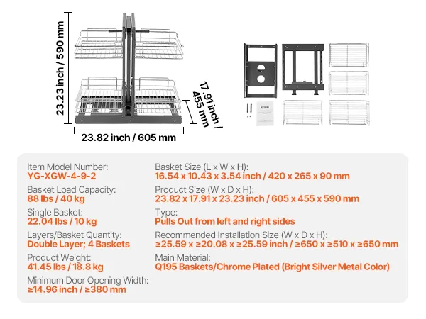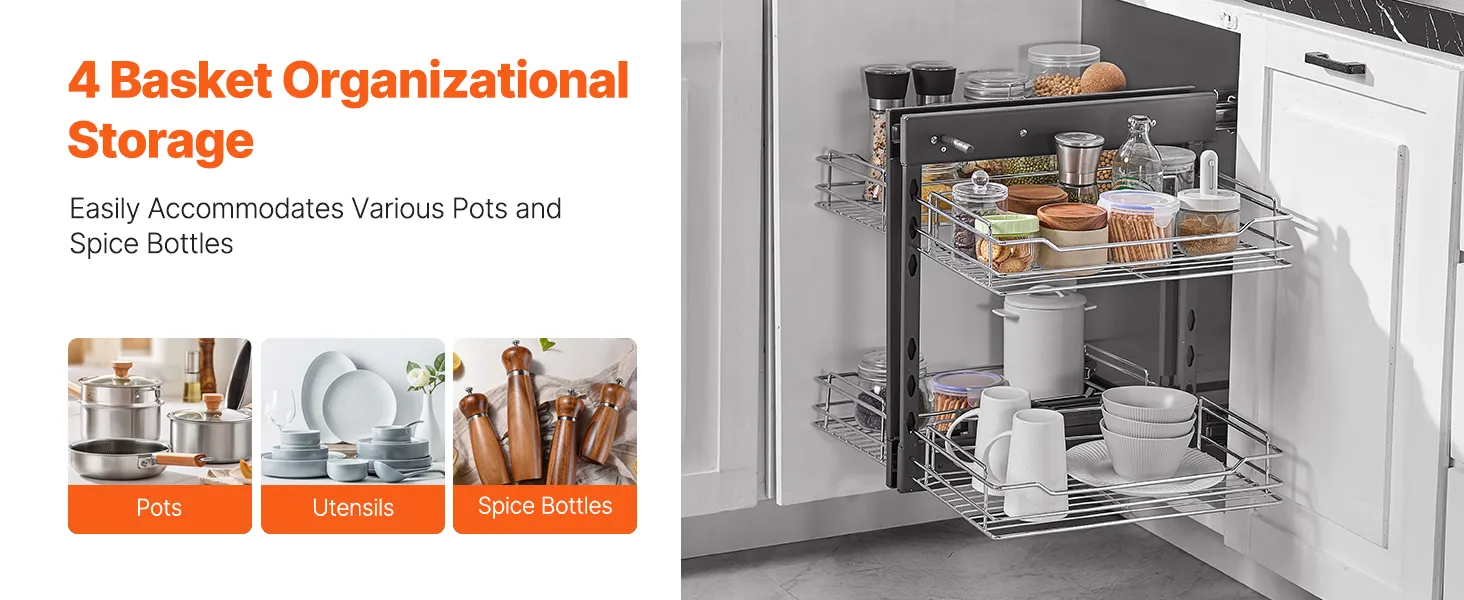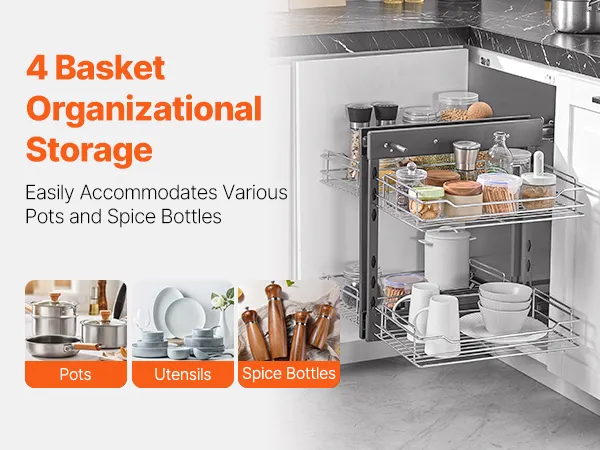 This pull-out basket features 4 large capacity baskets that allow for quick item retrieval through efficient categorization, completely solving the issues of limited kitchen space and clutter.