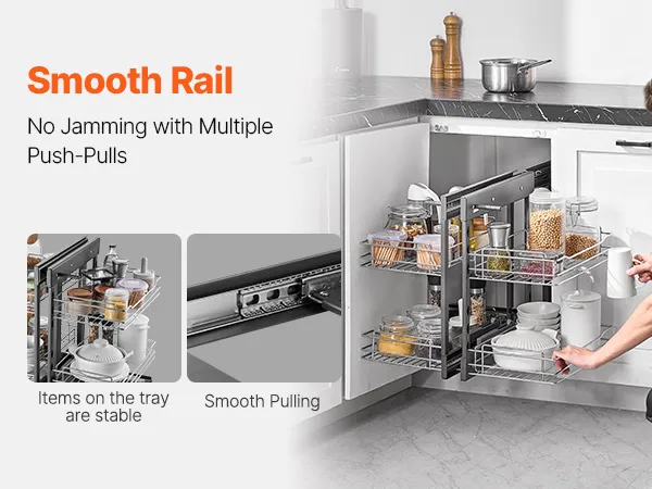 Our blind corner pull out organizer is designed to address kitchen corner blind spots, helping you effectively utilize space. The large capacity design can easily store various kitchen items, allowing you to smoothly pull them out without worrying about hard-to-reach corner items.