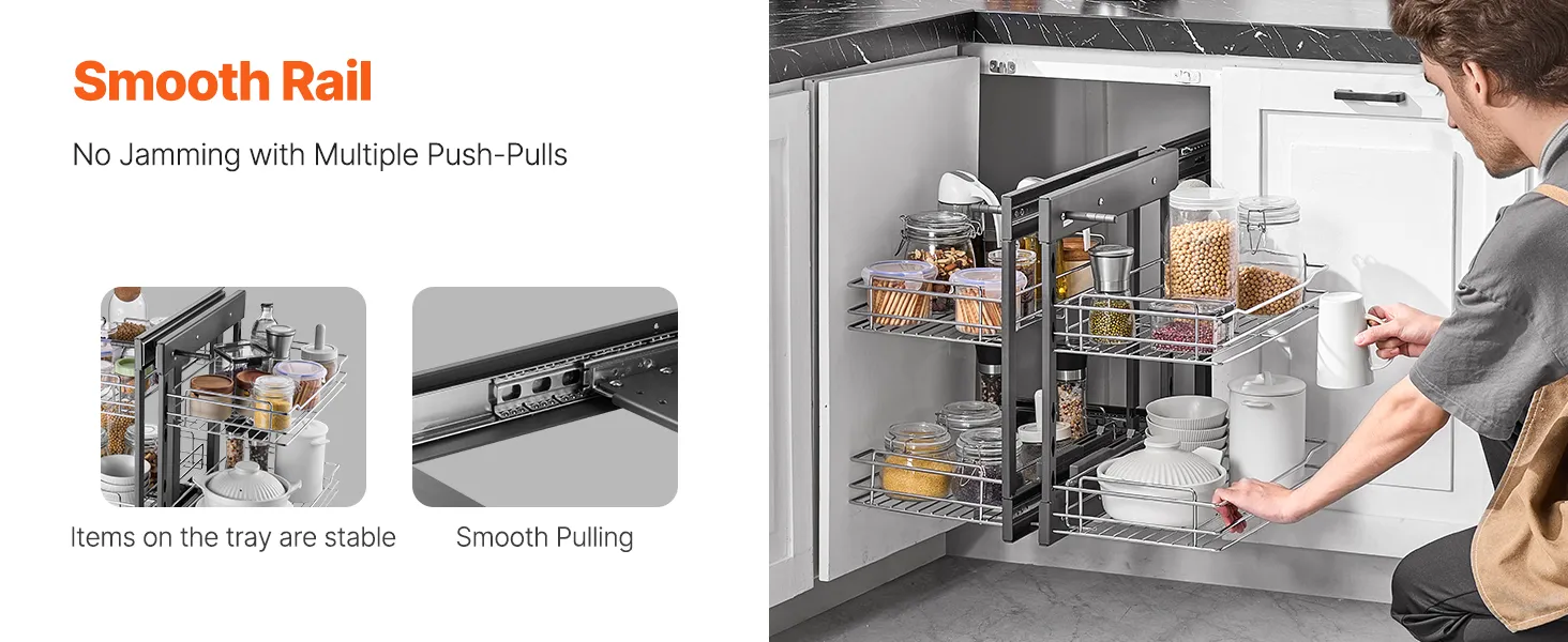 Cabinet Blind Spot Storage: The blind corner pull out organizer features a clever design that addresses kitchen corner blind spots, transforming hard-to-reach deep spaces into efficient storage areas and preventing wasted space.