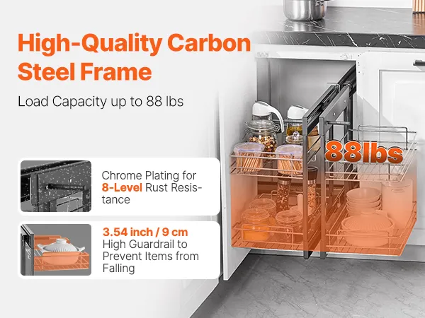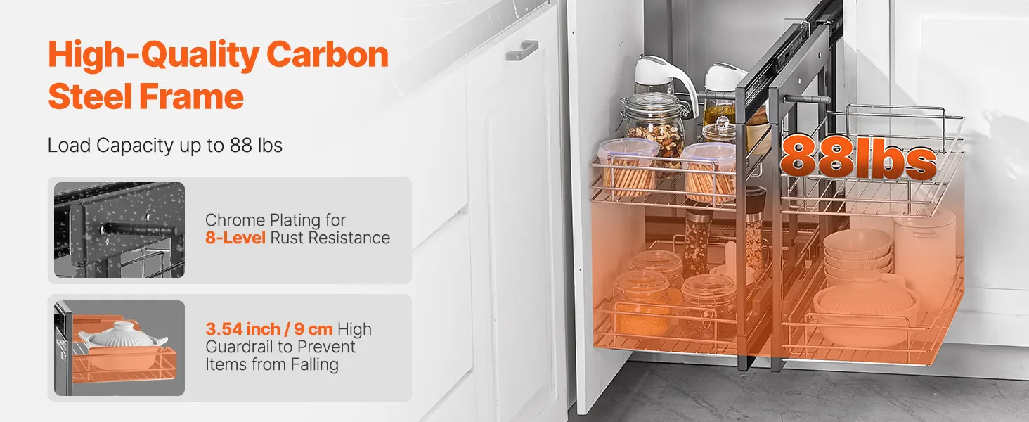 Sturdy Construction: Made with a carbon steel frame and chrome plating, the kitchen cabinet organizer exceeds a level 8 rust resistance rating, ensuring high durability and rust prevention. Each layer can support up to 22 lbs/10 kg, with a total weight capacity of 88 lbs/40 kg, making it suitable for heavy items.