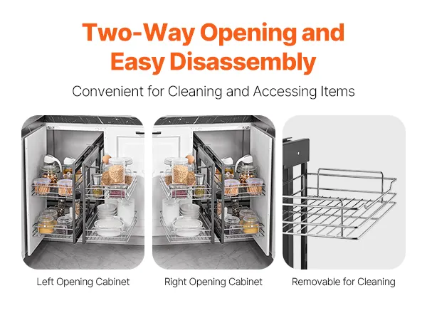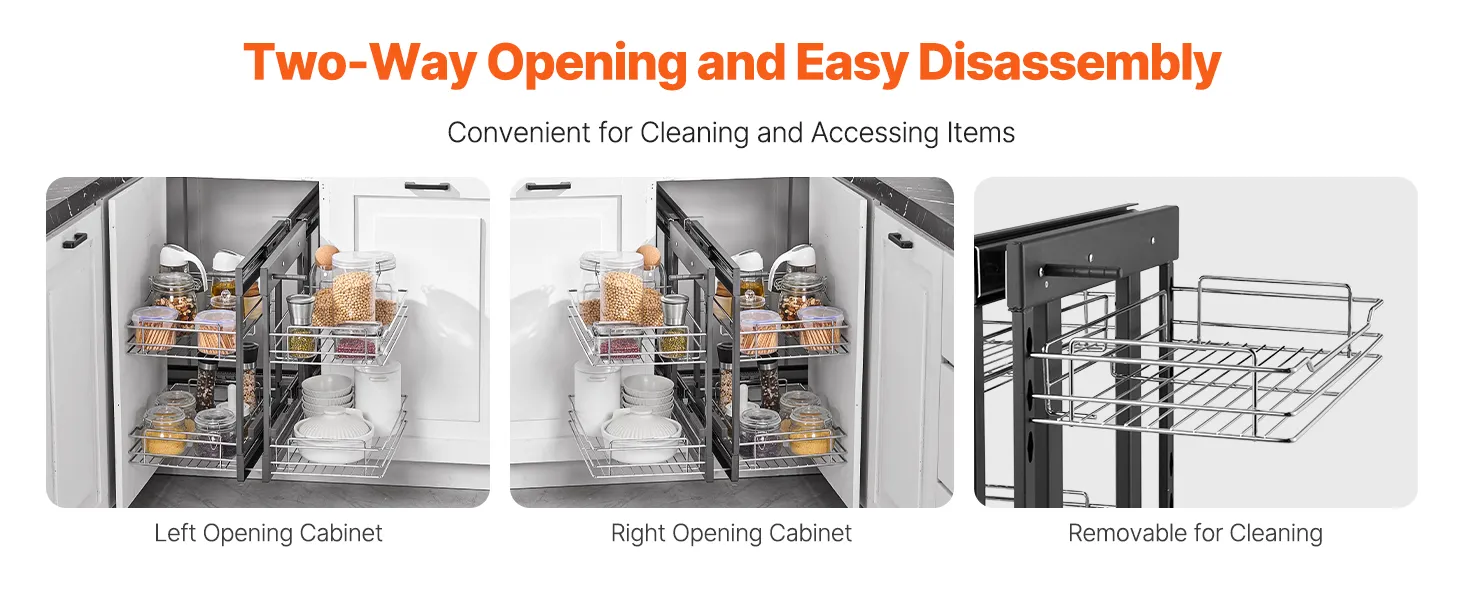 Compatible with Left or Right Opening Doors: A standout feature of this storage organizer rack is its support for installation in both left-opening and right-opening blind corner cabinets. Simply adjust the direction of the bottom bracket for a perfect fit with either door type, flexibly adapting to different kitchen layouts.