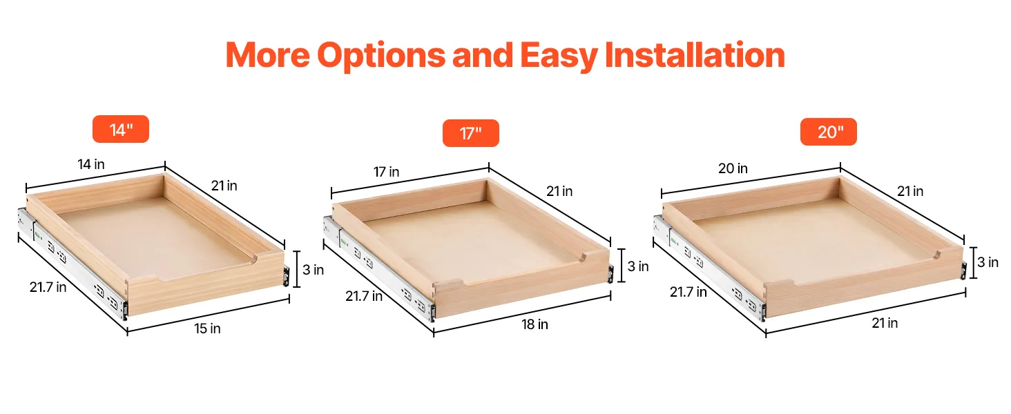 VEVOR Uitschuifbare ladekast (432 x 533 x 76 mm) met softclose-mechanisme, houten schuiflade aan de onderkant en zijkant, voor keuken, voorraadkast, badkamer