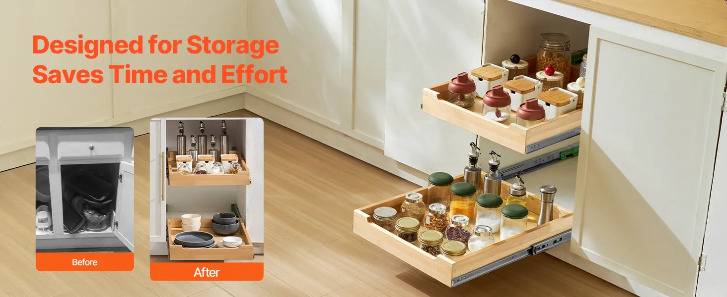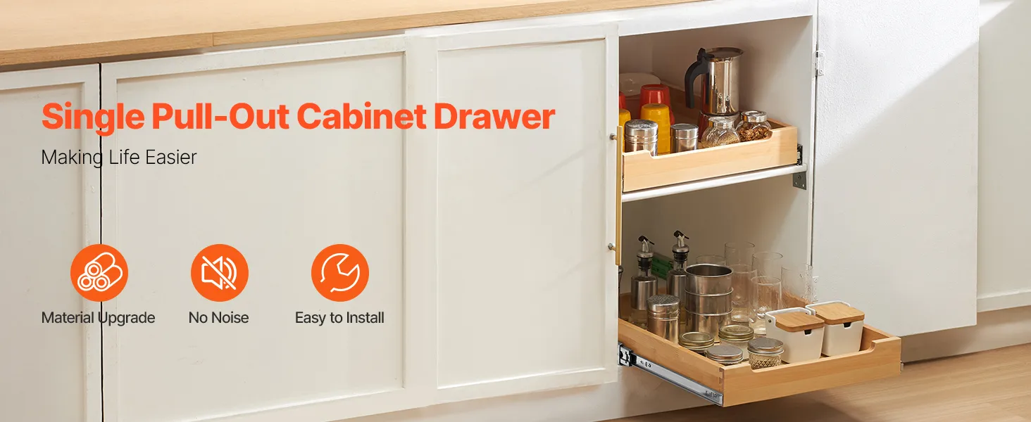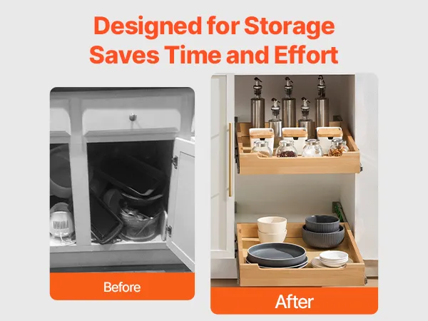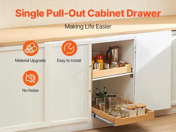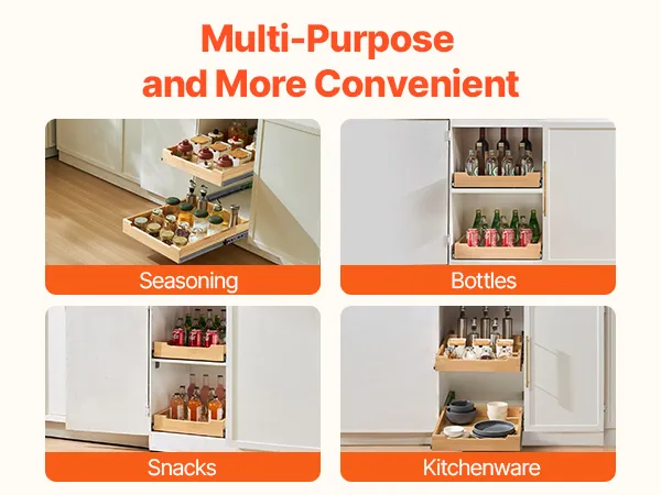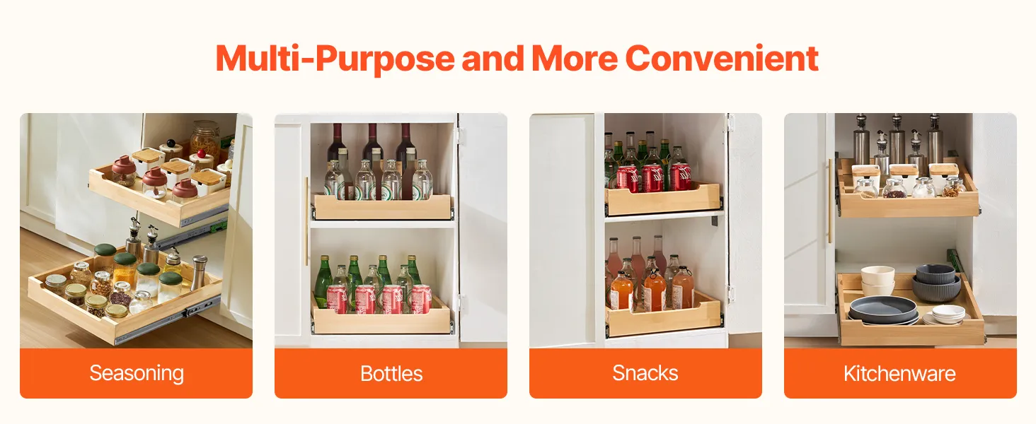 Deze uitschuifbare houten plank met zacht sluitmechanisme is ideaal voor gebruik in keukenkastjes, onderkasten en voorraadkasten. Het optimaliseert de ruimtebenutting en zorgt ervoor dat u potten, pannen en keukengerei gemakkelijker kunt opbergen en bereiken.