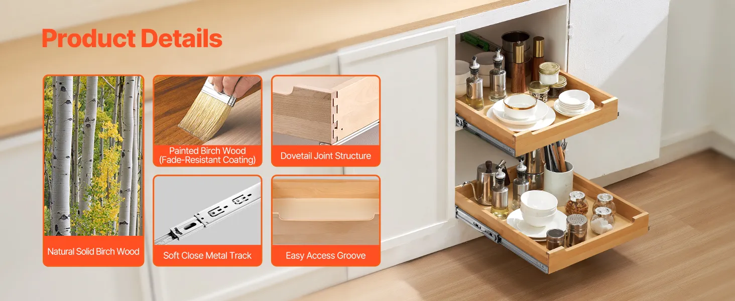 Materiaal: massief zwaluwstaarthout: de uittrekbare kastorganizer is gemaakt van duurzaam berkenhout en afgewerkt met een transparante laklaag om vervaging te voorkomen en de esthetiek te verbeteren. De zwaluwstaartverbinding zorgt voor duurzaamheid, terwijl de houten plank uw keuken georganiseerd houdt.