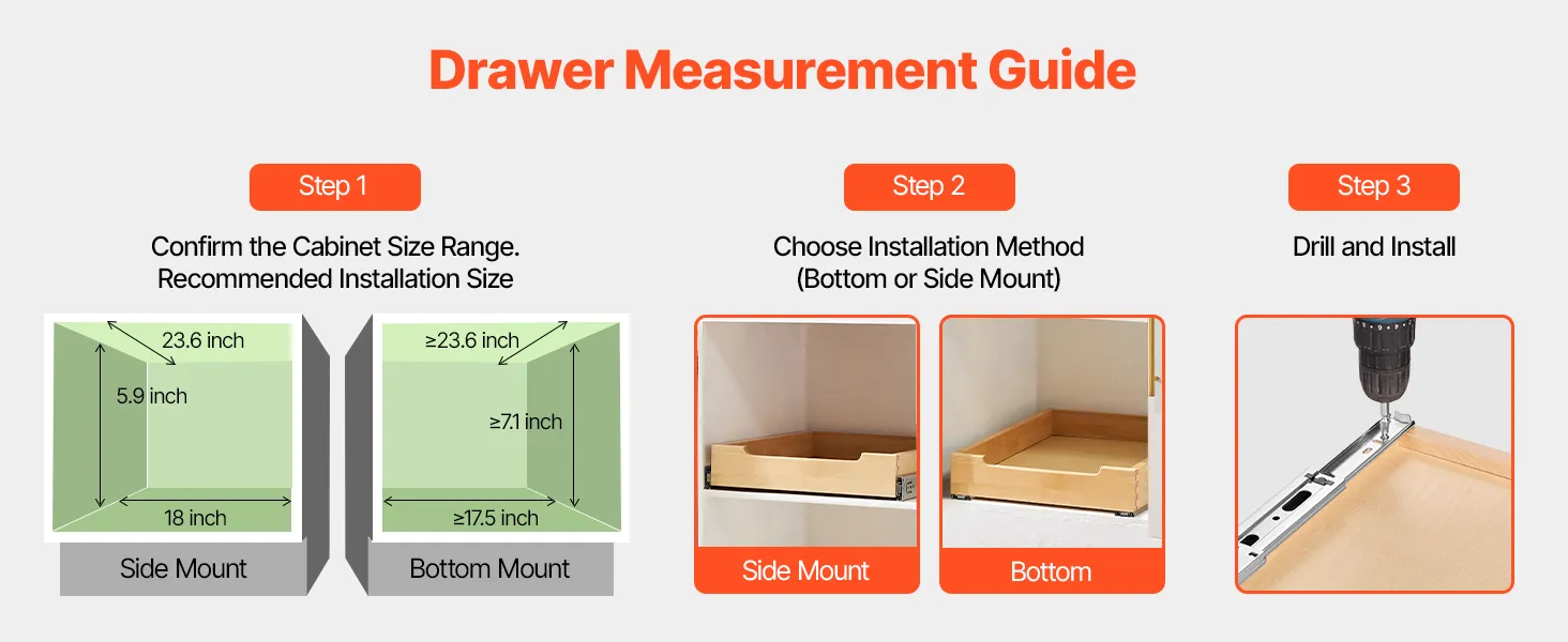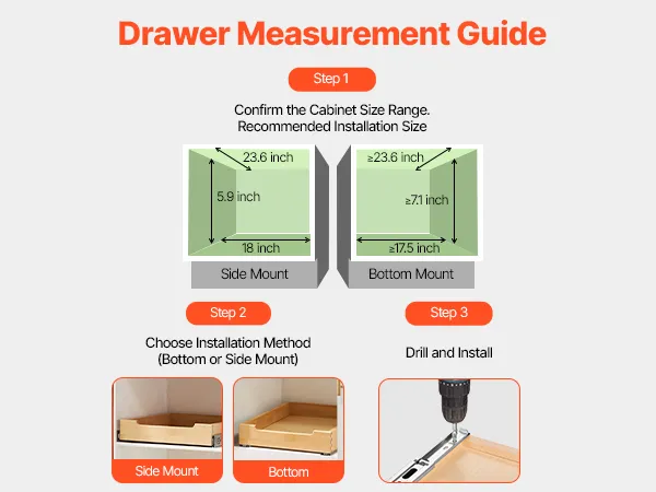 Eenvoudige installatie: De uitschuifbare houten plank met softclose-functie biedt 2 installatiemethoden voor de rails en wordt geleverd met stapsgewijze instructies en alle benodigde accessoires. Aanbevolen installatieafmetingen: Zijmontage: ≥ 18 x ≥ 23,6 x ≥ 5,9 inch; Vloermontage: ≥ 17,5 x ≥ 23,6 x ≥ 7,1 inch. Zorg ervoor dat u uw kledingkast opmeet voordat u tot aankoop overgaat en kies de juiste maat.