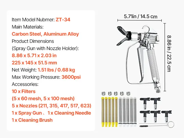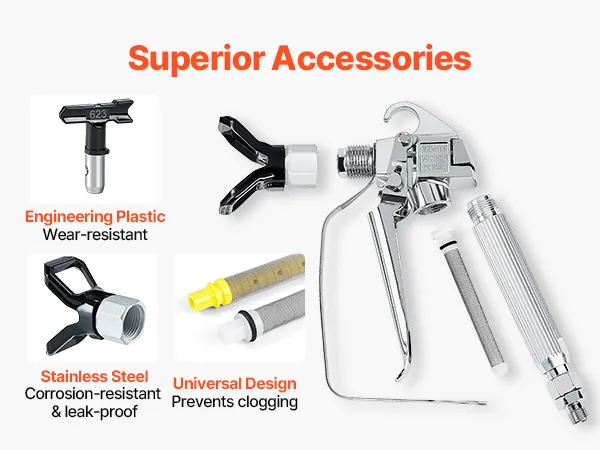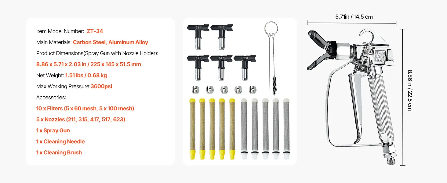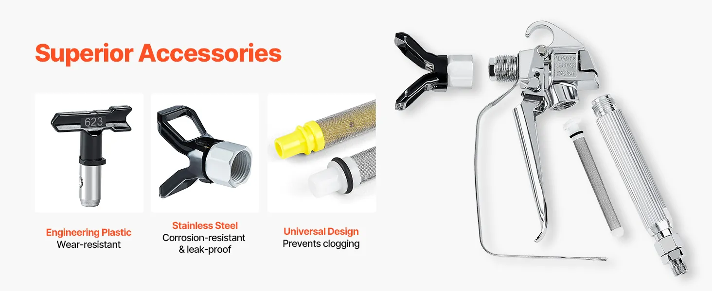 Compatibiliteit: Ons airless verfspuitpistool werkt met verschillende merken spuitpistolen, waardoor het een ideale keuze is voor zowel thuisgebruikers als professionals. Het is compatibel met de sproeiermodellen 211, 315, 417, 517, 623