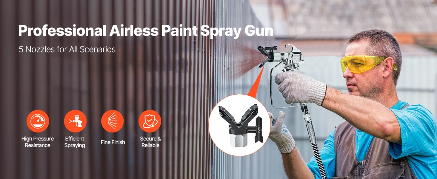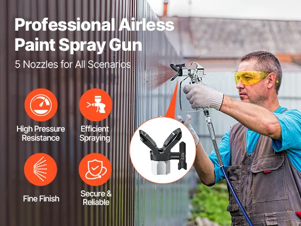 Efficiënt spuiten: Ons professionele airless verfspuitpistool met een maximale werkdruk van 3600 psi zorgt voor een gelijkmatige en efficiënte verfaanbreng. Perfect voor verschillende spuitvereisten en verhoogt de productiviteit van het werk