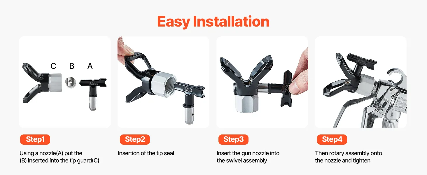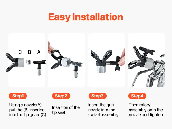 Dankzij de eenvoudige installatiestappen kunt u uw airless spuitpistool snel onderhouden, zonder dat u professionele technici of ingewikkelde gereedschappen nodig hebt. Dit vermindert de onderhoudsinspanning.