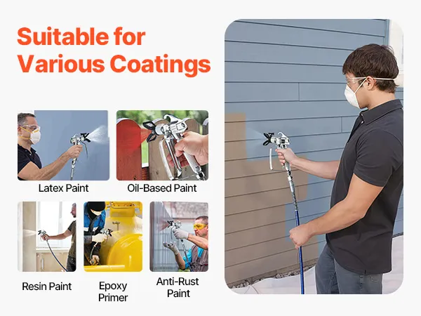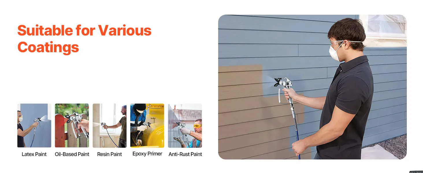 Dit airless verfspuitpistool is geschikt voor veel soorten verf en kan voor verschillende toepassingen worden gebruikt. Hierdoor is het niet meer nodig om het apparaat regelmatig te verwisselen en speelt het pistool in op de verschillende behoeften van de gebruiker.