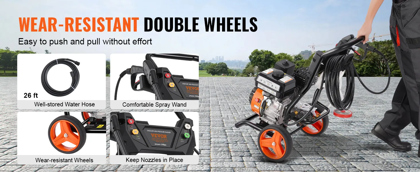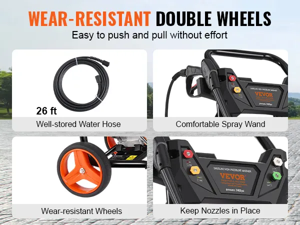 Easy to Move: Our gas power washer is made of sturdy steel frame with 26ft long wear-resistant high-pressure water hose, all the accessories are conveniently stored on the machine so you don't have to worry about losing any parts. Using this machine will make your cleaning tasks simpler and easier.