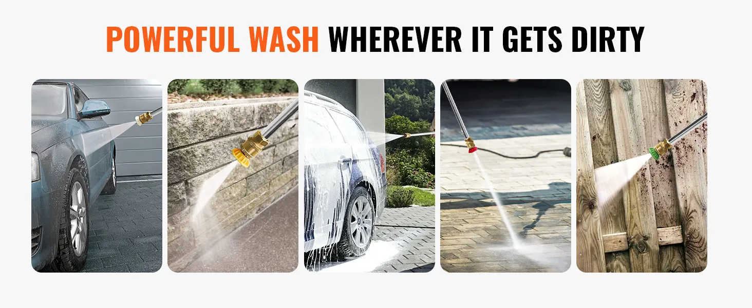 Versatile Application: Our pressure washer comes with 5 quick-connect metal nozzles (0°/15°/25°/40°/soap nozzles) ranging from high-impact water jets to soft sprays. The absolute best for your different cleaning tasks and save unnecessary expenses.