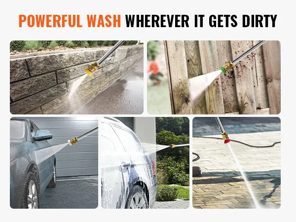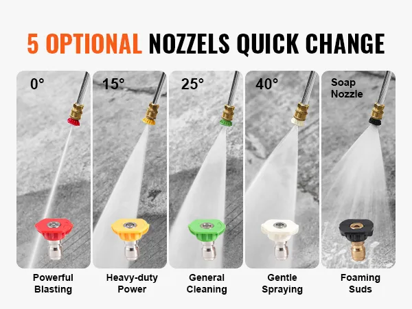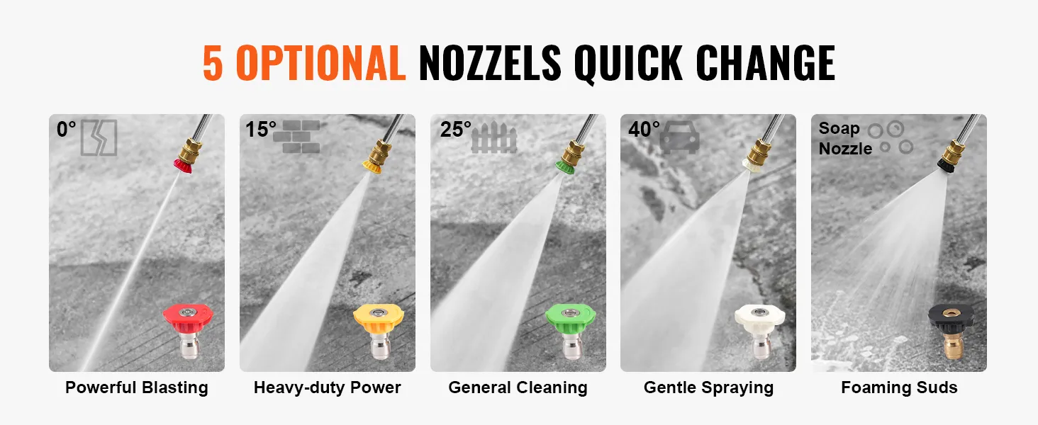 Versatile Application: Our pressure washer comes with 5 quick-connect metal nozzles (0°/15°/25°/40°/soap nozzles) ranging from high-impact water jets to soft sprays. The absolute best for your different cleaning tasks and save unnecessary expenses.