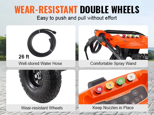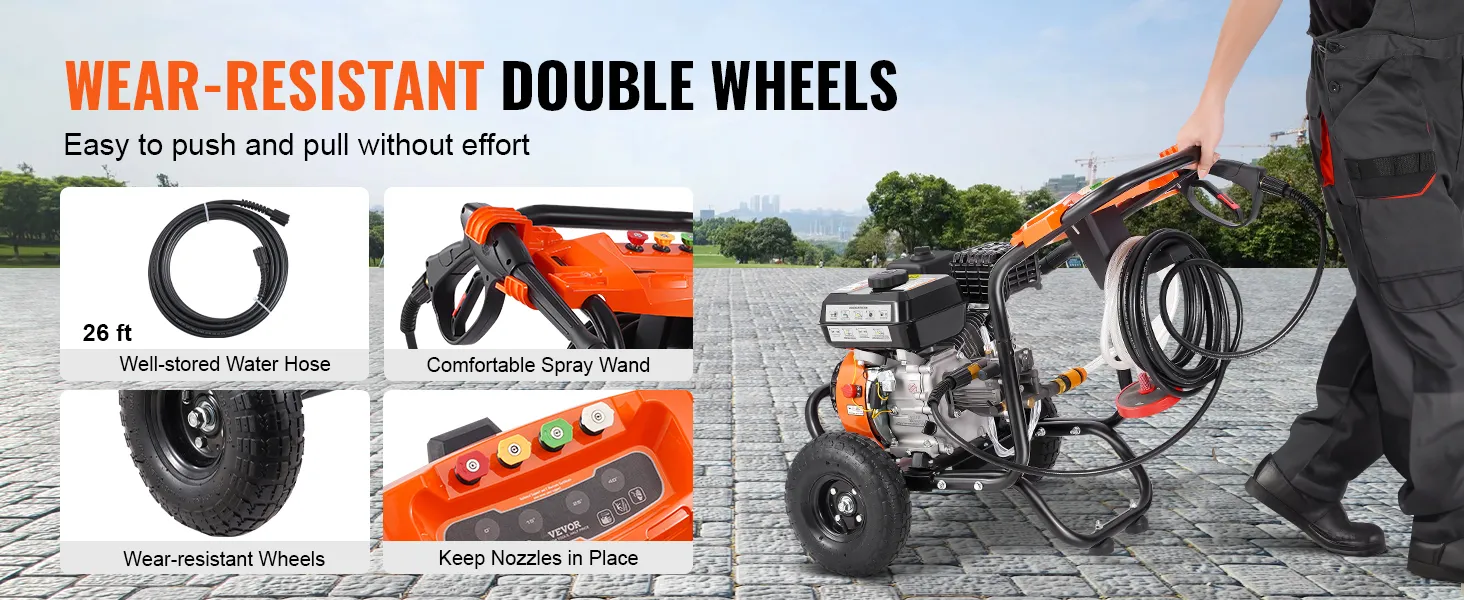 Easy to Move: Our gas power washer is made of sturdy steel frame with 26ft long wear-resistant high-pressure water hose, all the accessories are conveniently stored on the machine so you don't have to worry about losing any parts. Using this machine will make your cleaning tasks simpler and easier.