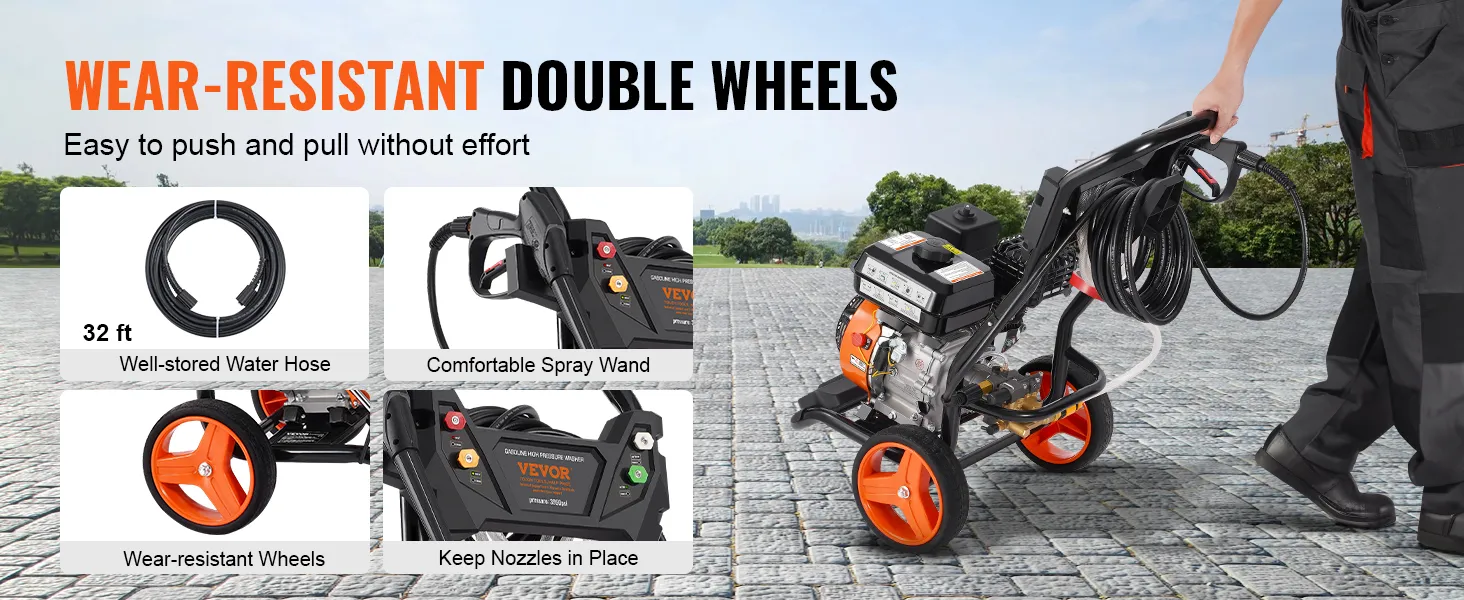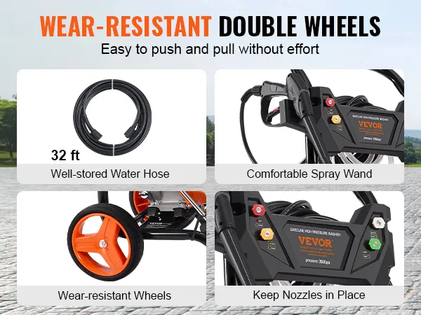 Easy to Move: Our gas power washer is made of sturdy steel frame with 26ft long wear-resistant high-pressure water hose, all the accessories are conveniently stored on the machine so you don't have to worry about losing any parts. Using this machine will make your cleaning tasks simpler and easier.