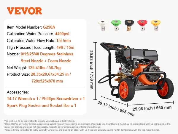 Efficiënte en betrouwbare motor: deze door benzine aangedreven hogedrukreiniger beschikt over een krachtige 390cc vierspaaksmotor met een inhoud van 0,8 liter benzine. Hij is eenvoudig te starten en heeft een koperen pomp van 7 pk. Als je een doe-het-zelver bent die kracht en prestaties waardeert, dan is deze reiniger de perfecte keuze voor jou.